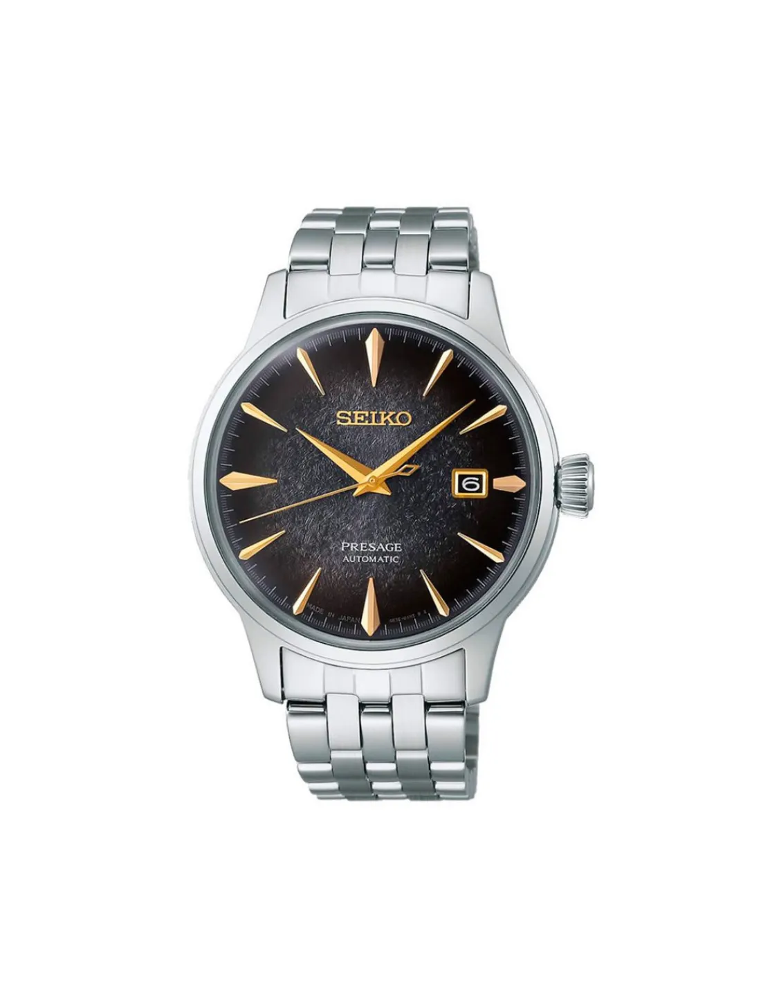 Reloj Seiko Presage Cocktail Time con caja de acero de 40,5 mm de diámetro, esfera color gris degradado, cristal de Hardlex y brazalete de acero. Calibre 4R35. Movimiento automático con capacidad de carga manual y una duración de 41 horas aproximadamente. Edición limitada a 9.000 piezas.