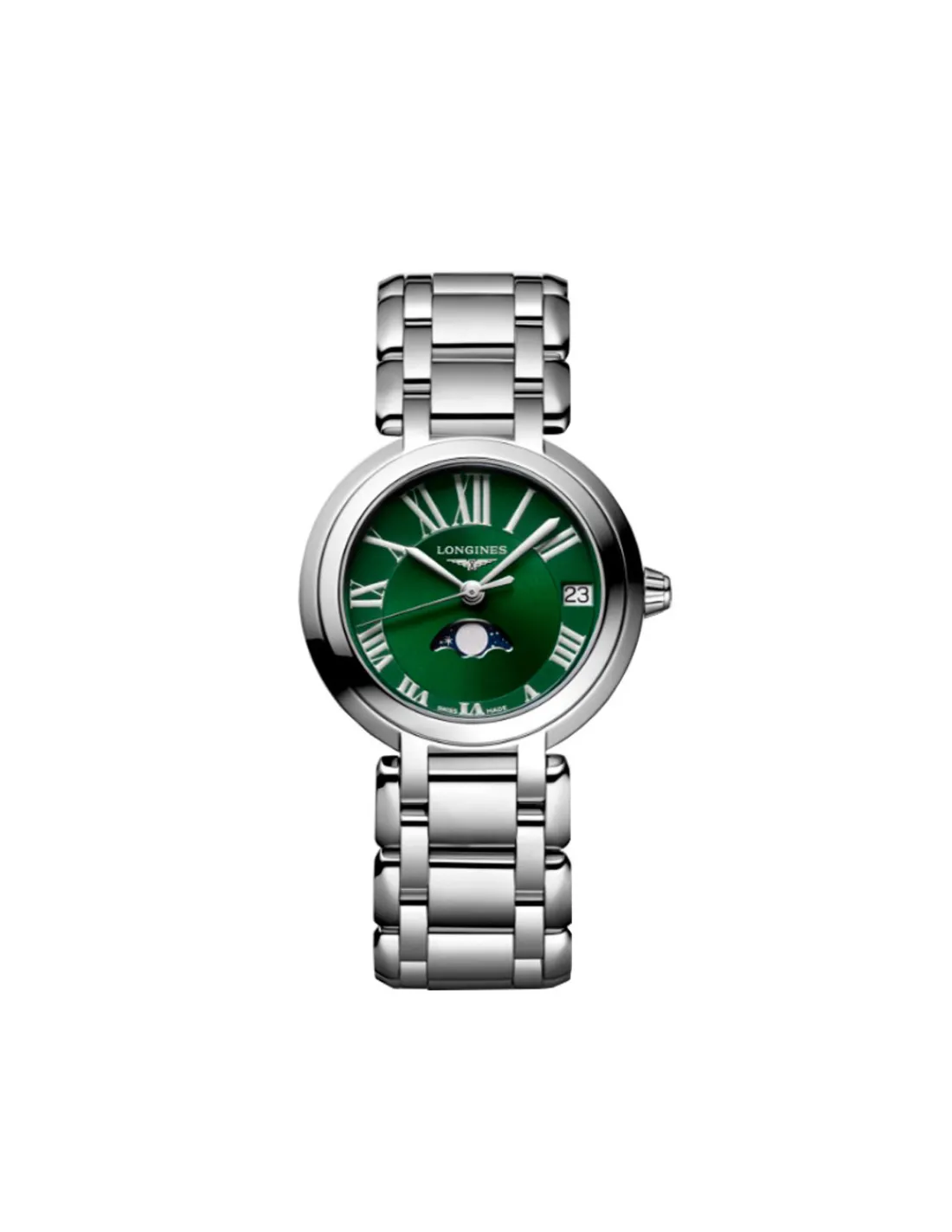 Reloj Longines PrimaLuna L8.115.4.61.6 para mujer con esfera verde y caja y brazalete acero. Movimiento de cuarzo Swiss Made y fase lunar.