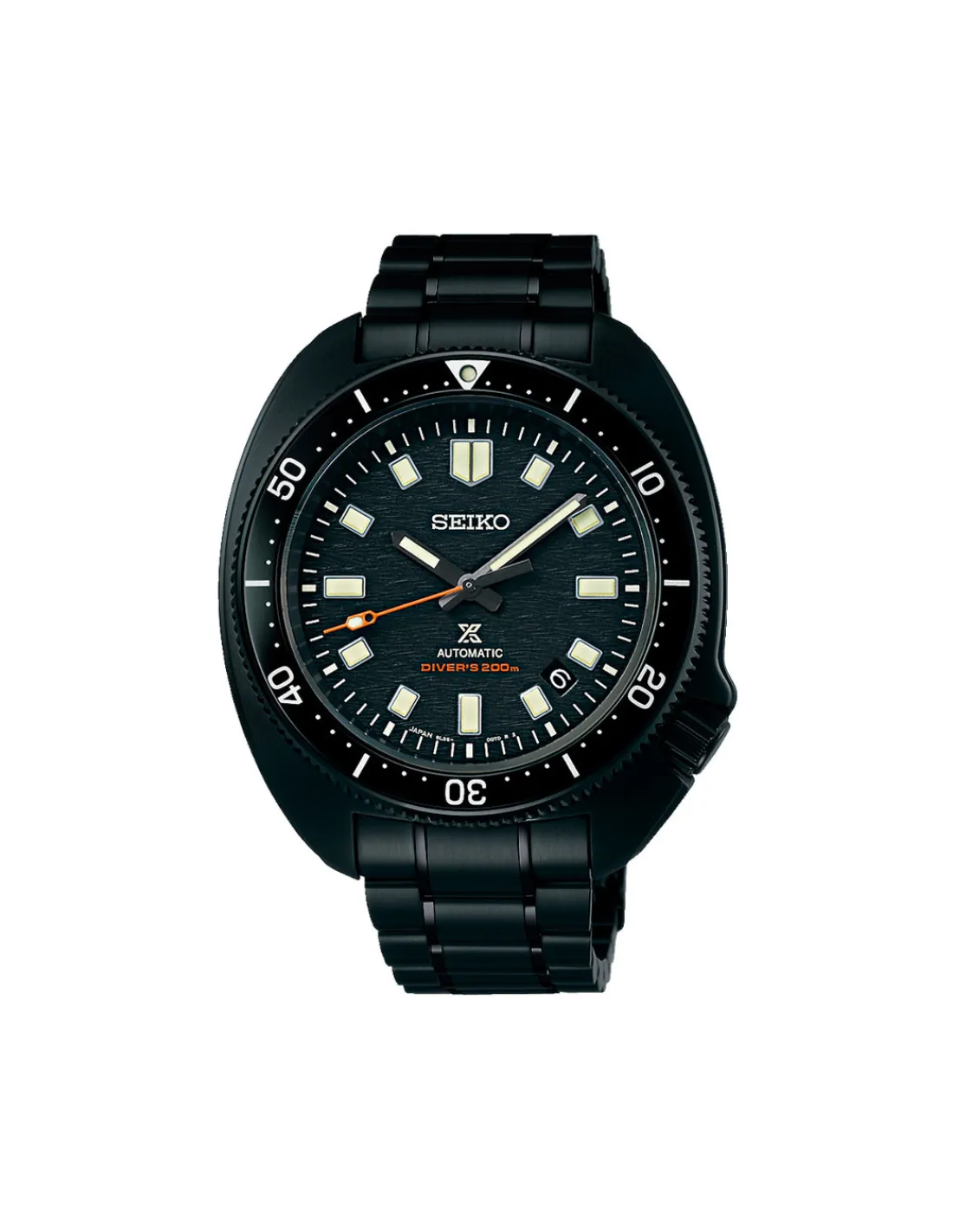 Reloj Seiko Prospex Mar Edición Limitada para hombre con caja de acero negro de 44 mm, esfera negra y brazalete.Un reloj específico para buceo con la corona en posición a las cuatro en punto, reinterpretación de 1970 Automatic Divers con movimiento automático, calibre 8L35 y 50 horas de reserva de marcha aproximadamente.