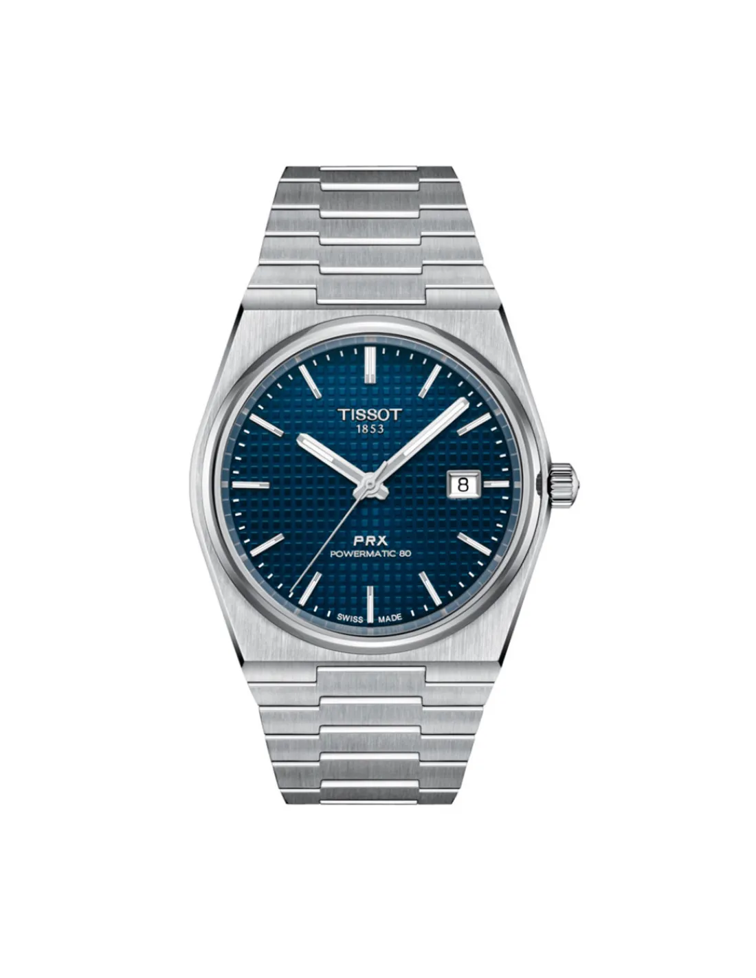 Reloj Tissot PRX Powermatic 80 para hombre con caja de acero de 40 mm de diámetro con forma de barril, esfera azul con índices y agujas superluminova, cristal de zafiro irrayable con revestimiento antirreflejos y brazalete de acero. Con 80 horas de reserva de marcha, es un movimiento moderno diseñado para seguir el ritmo de de vida de todos los estilos. Movimiento automático Swiss Made.