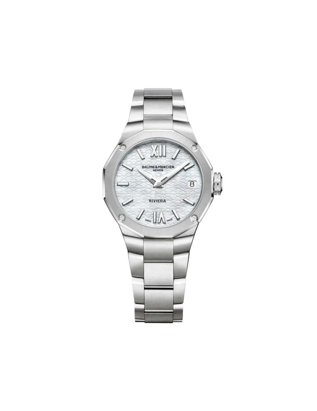 Reloj Baume Et Mercier Riviera con caja de acero de 33 mm, esfera nácar forrada con ondas transparentes y 4 diamantes en el bisel, números romanos, índices remachados con Superluminova y agujas facetadas rodiadas combinado con brazalete de acero. Un reloj con un diseño original idóneo para fuertes personalidades. Movimiento de cuarzo Swiss Made.