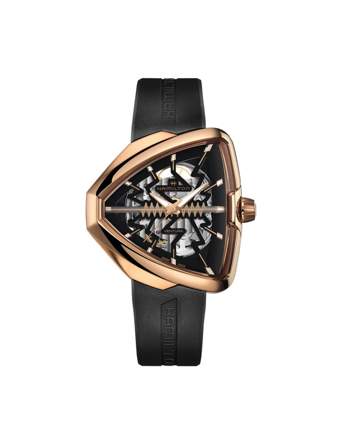 Reloj Hamilton Ventura Elvis80 Skeleton con caja de acero rectangular 42,5 x 44,6 mm, un tributo ultramoderno al pasado, presente y futuro del primer reloj eléctrico del mundo. Es la poderosa evolución de un reloj revolucionario, su esfera esqueletizada con precisión presenta un llamativo zigzag en el centro, que combina con la elegante caja triangular con revestimiento de PVD de oro rosa luminiscente. Este rayo de energía rinde homenaje a un símbolo icónico de la innovación y atrae la mirada hacia el movimiento automático H-10-S que se encuentra debajo.