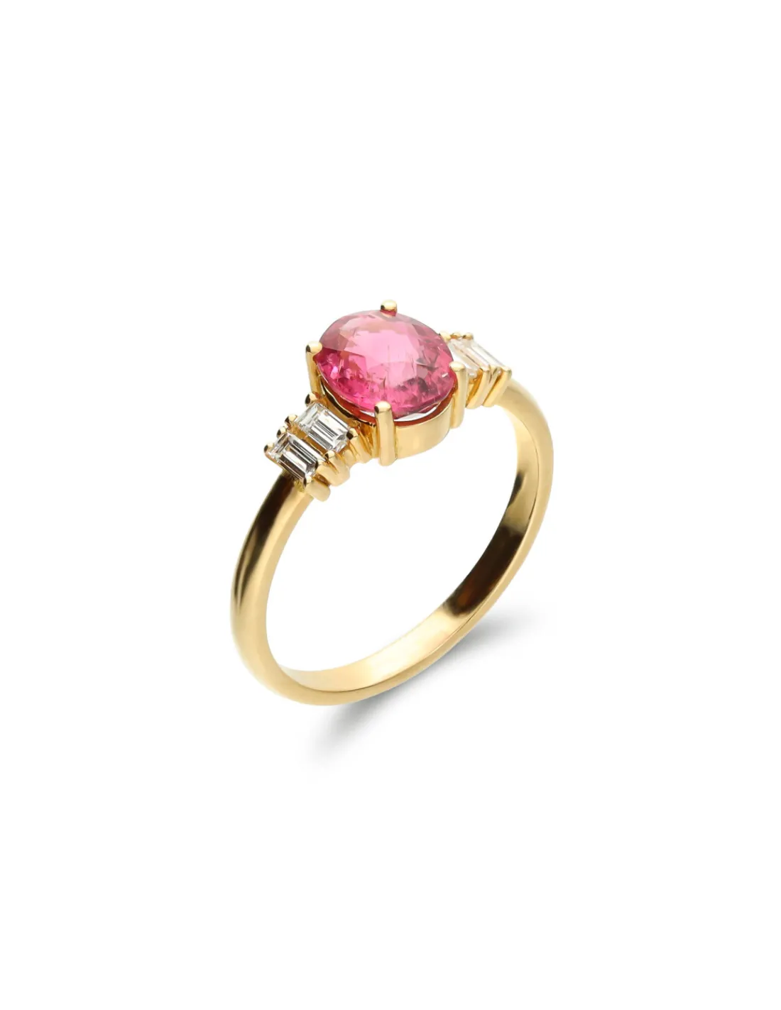Anillo de oro amarillo 1ª Ley (750 mmas) con turmalina talla oval en el centro y diamantes talla baguette a los laterales. Una joya sencilla y elegante para usar a diario o en momentos más especiales.