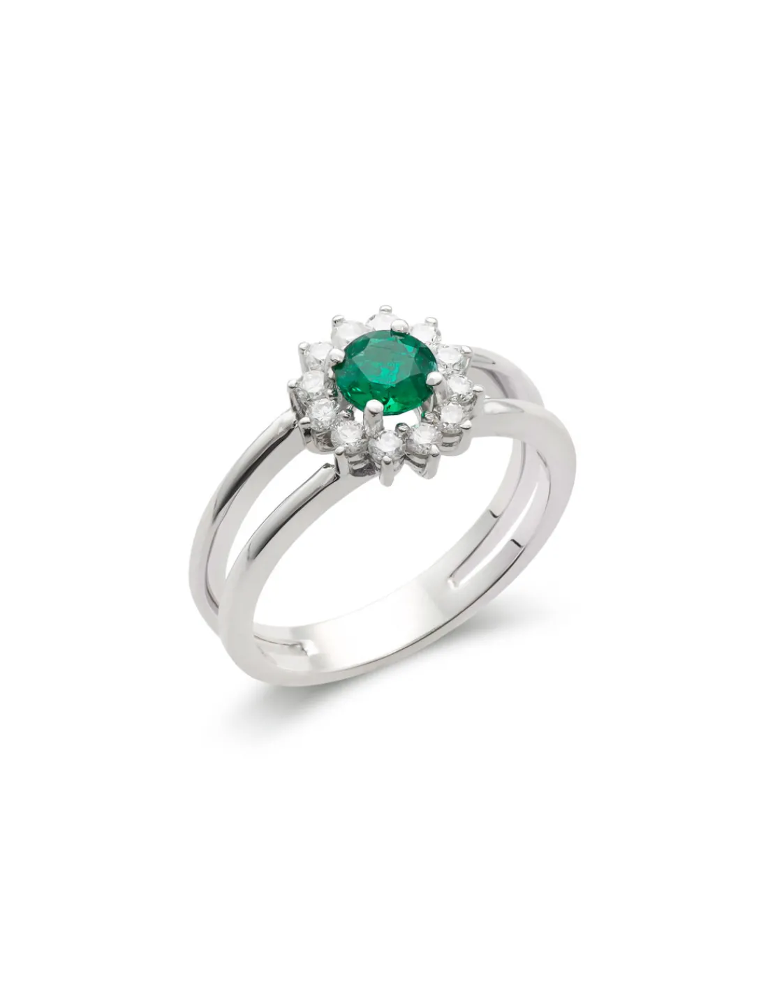 Anillo de oro blanco 1ª Ley (750 mmas) con doble aro combinado con esmeralda natural redonda rodeada de diamantes talla brillante. Una joya perfecta y atemporal para pedida de mano.