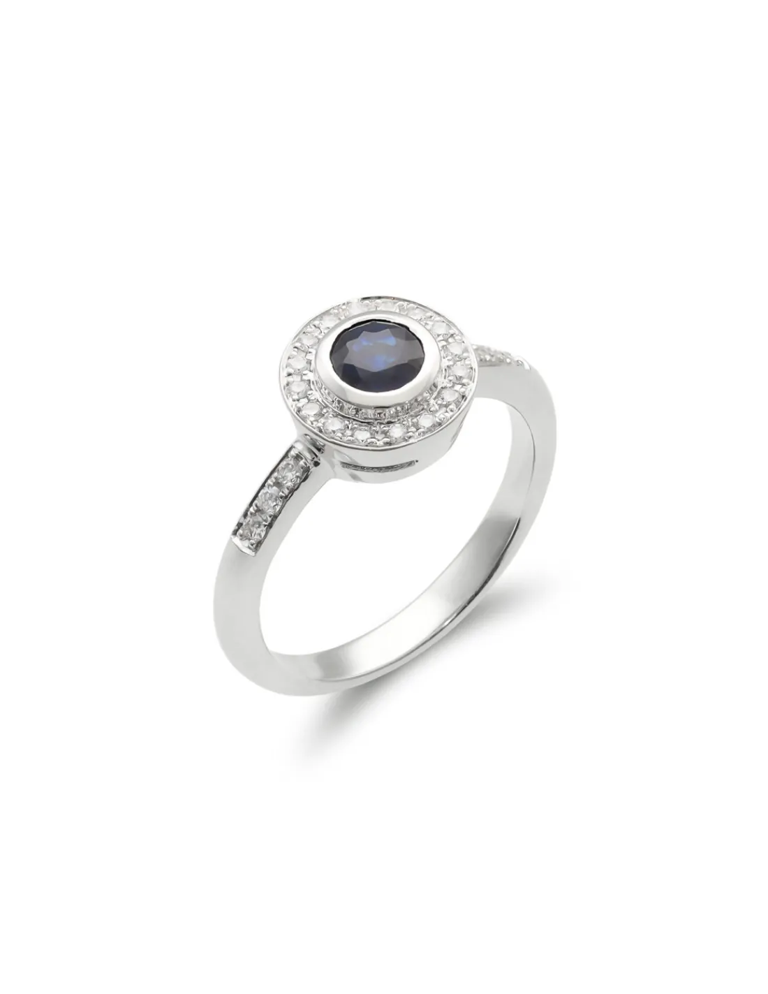 Anillo de oro blanco 1ª Ley (750 mmas) con un zafiro natural redondo en el centro rodeado de una orla de diamantes y también en los laterales del aro. La opción idónea para pedida de mano.