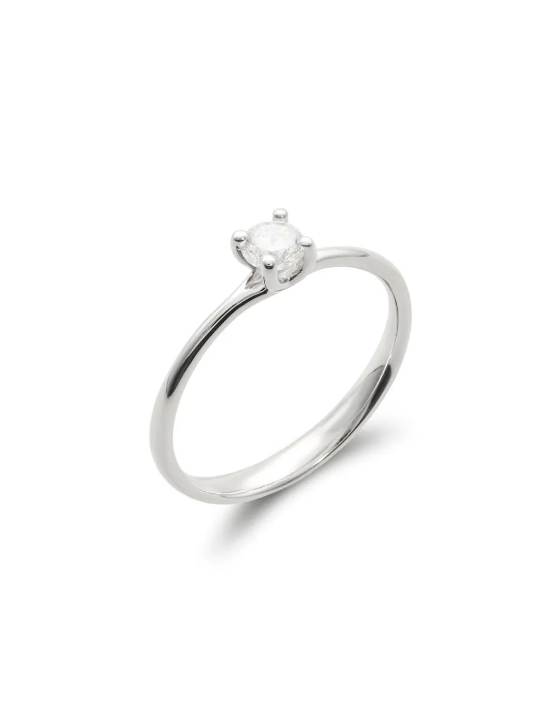 Anillo-Solitario de oro blanco 1ª Ley (750 mmas) con diamante talla brillante. Una joya especial y actual que combina a la perfección con cualquier alianza.