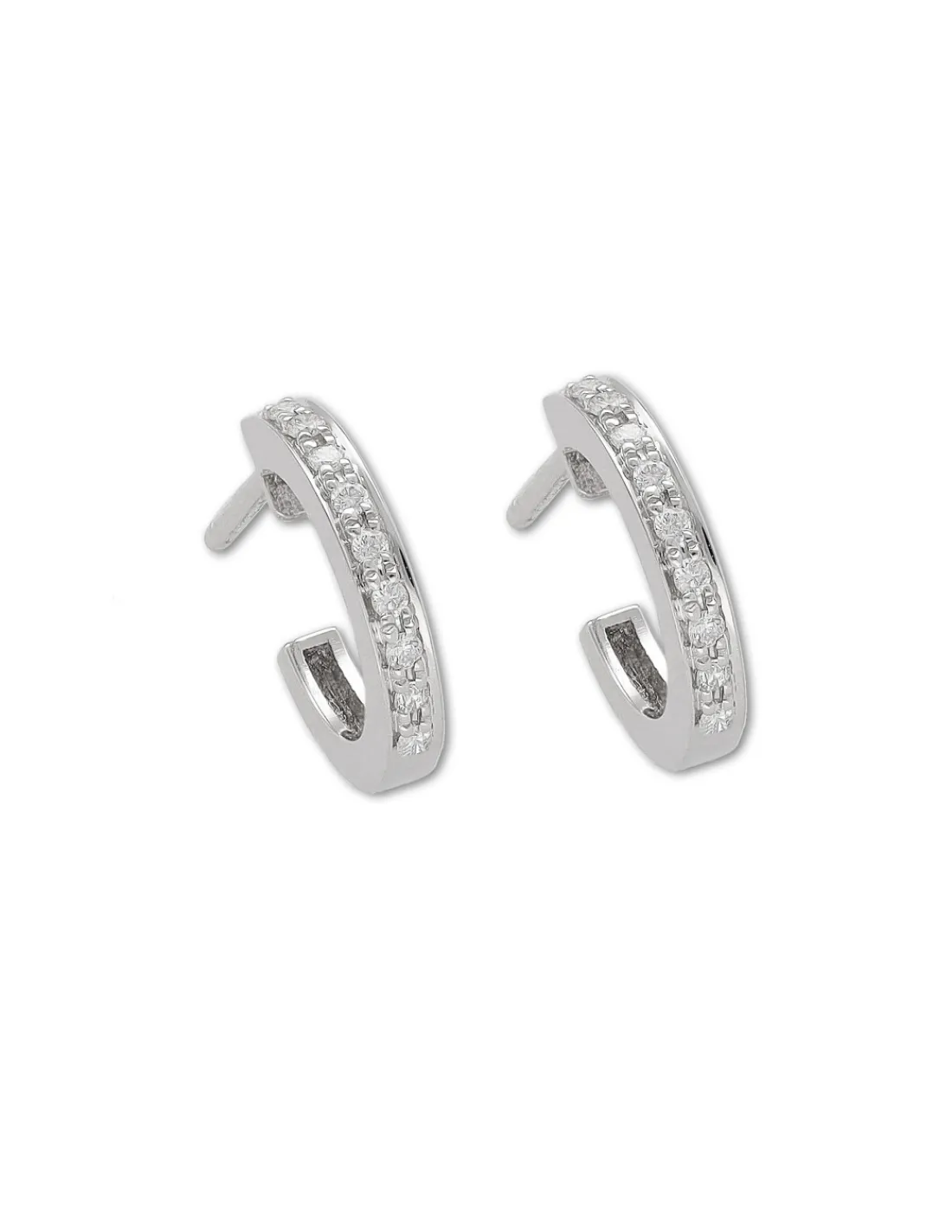 Argollas de oro blanco 1ª Ley (750 mmas) con diamantes redondos naturales engastados en grano en la parte frontal. Una joya muy versátil y chic que te hará brillar a diario. Cierre de palillo y presión. Tamaño aproximado 1,3 cm.