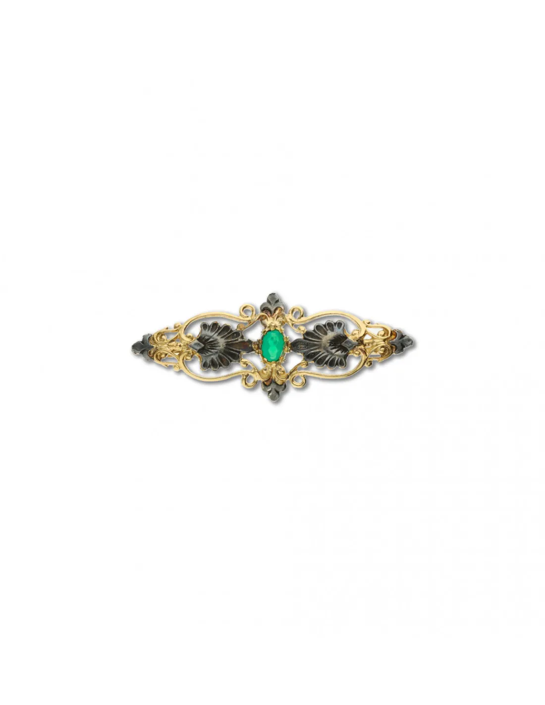 Broche de plata 1 Ley (925 mmas) con parte plateada/dorada y piedra verde oval en el centro.