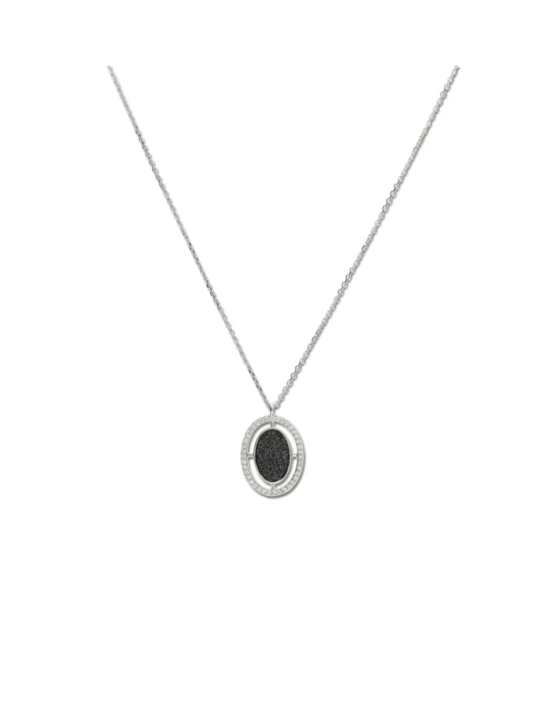 Cadena-Colgante de oro blanco 1ª Ley (750 mmas) con piedra negra ónix oval rodeada por una orla de diamantes talla brillante.