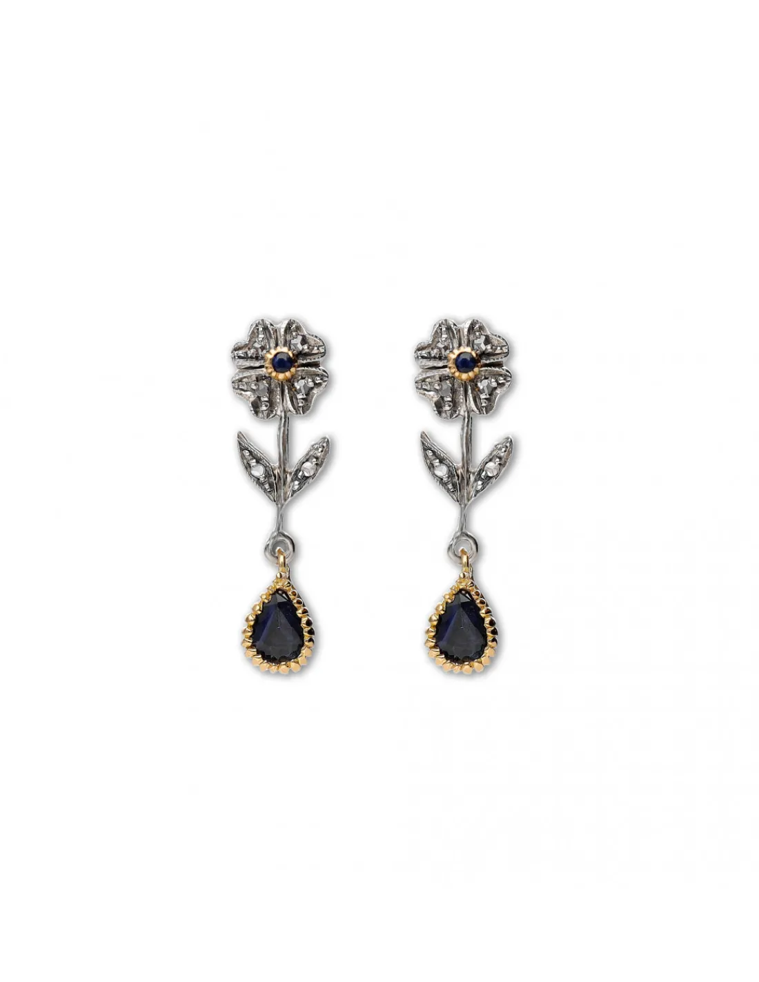 Pendientes de oro amarillo de 14 kt (585 mmas) combinado con plata, zafiros naturales talla pera y redondos y diamantes talla roca. Una joya vintage gracias a su frente de plata pavonada con un diseño en forma de flor. Cierre de palillo y presión. Largo total del pendiente 2,3 cm.