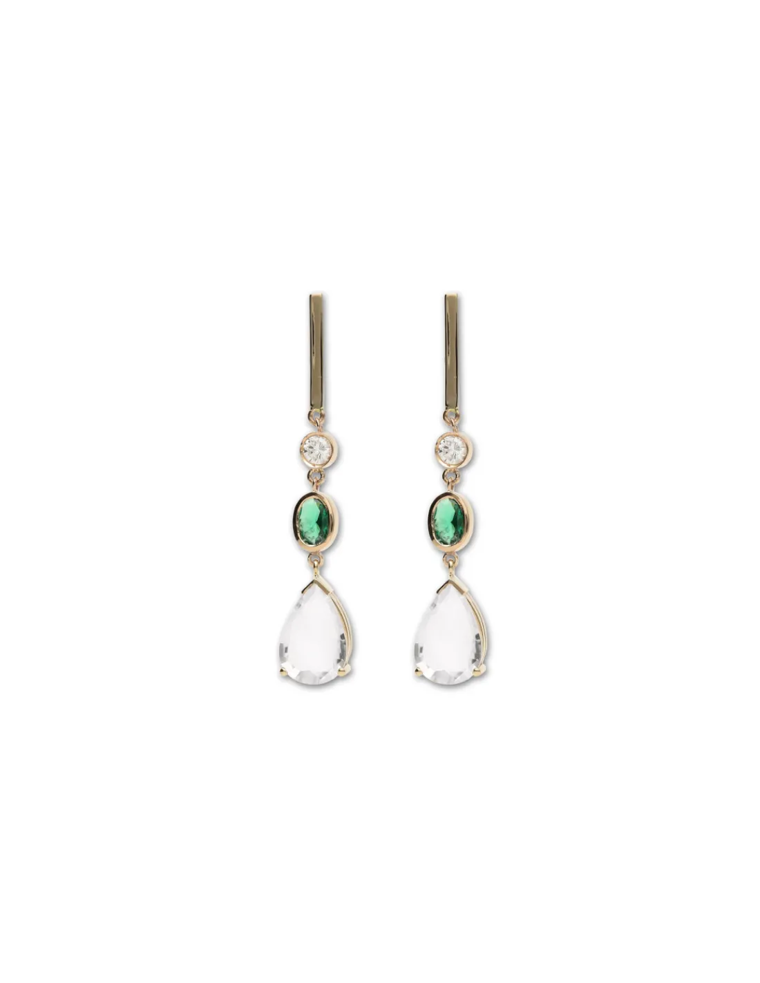 Pendientes de oro amarillo 9 kt (375 mmas) con barra rígida de la que cuelga una circonita combinada con piedra verde y cuarzo blanco talla pera briolette. Cierre de palillo y presión. Tamaño aproximado 4,5 cm.