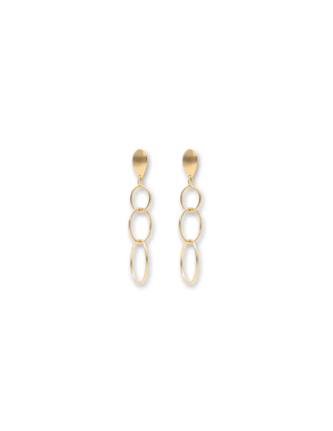 Pendientes de oro amarillo 1ª Ley (750 mmas) con dije oval del que cuelgan varios aros entrelazados. Cierre de palillo y presión. Tamaño aproximado 4,2 cm.