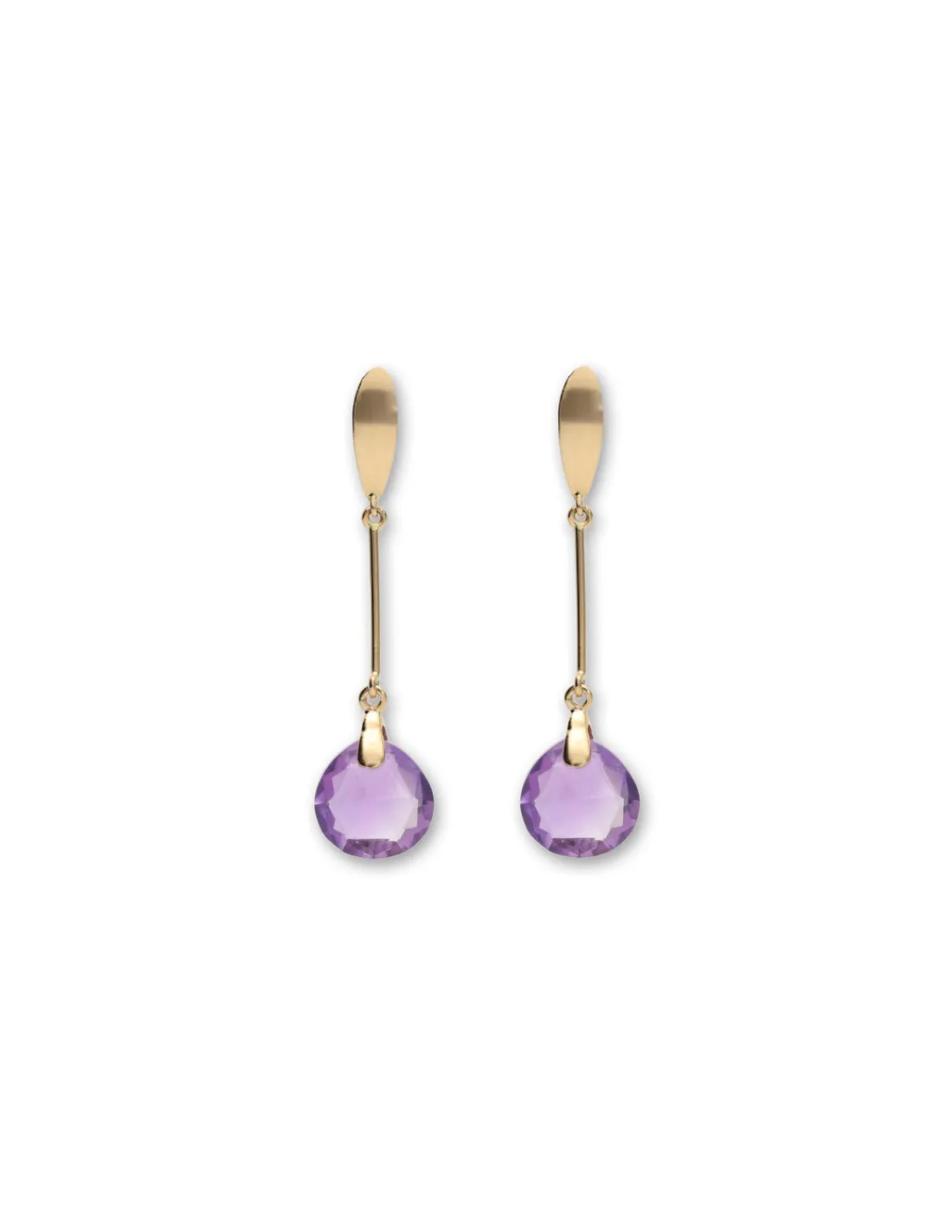 Pendientes de oro amarillo 1ª Ley (750 mmas) combinados con amatista talla pera briolette. Cierre de palillo y presión. Largo aproximado 4,1 cm.