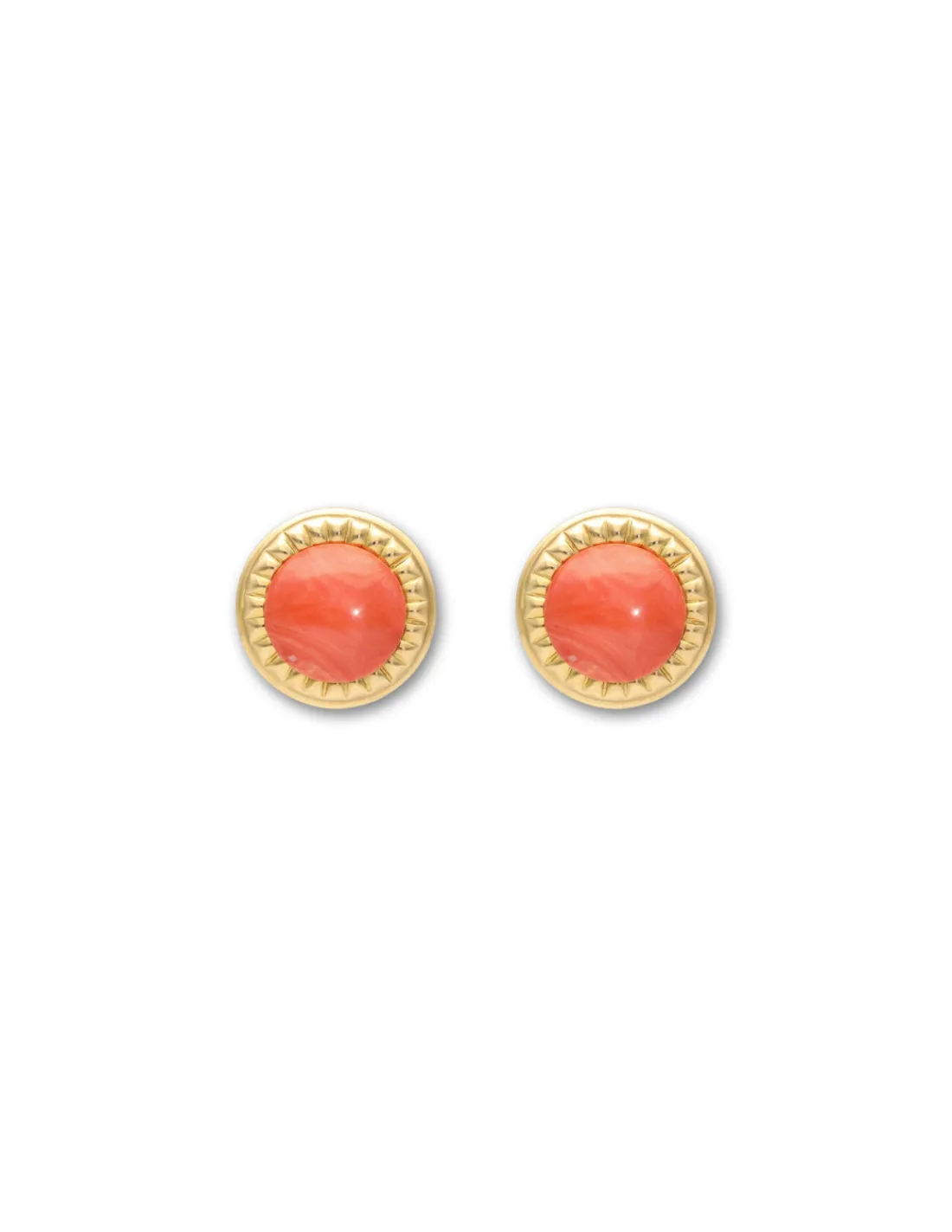 Pendientes de oro amarillo 1ª Ley (750 mmas) con forma de botón combinado con coral redondo cabujón y cierre omega. Diámetro aproximado 26 mm.