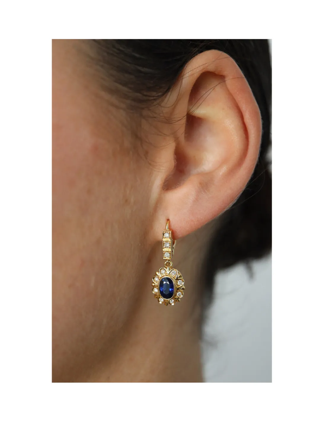 Pendientes de oro amarillo 1ª Ley (750 mmas) con diamantes talla brillante y zafiro talla oval. Un pendiente antiguo, estilo vintage.