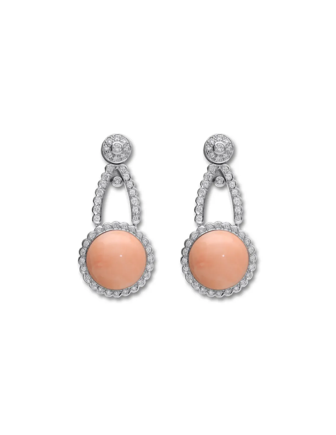 Pendientes de oro blanco 1ª Ley (750 mmas) con diamantes talla brillante y coral piel de ángel. Una extraordinaria pieza de joyería fina con carácter llamativo y un brillo único.