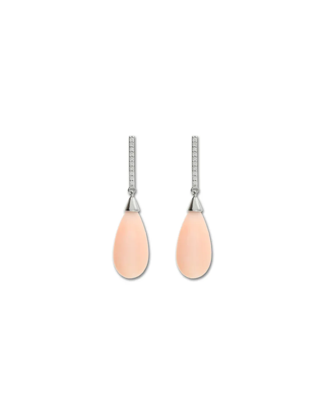Pendientes de oro blanco 1ª Ley (750 mmas) con barra rígida engastada con diamantes talla brillante de la que cuelga una perilla de coral rosa. Cierre de palillo y presión. Largo aproximado 4,5 cm.