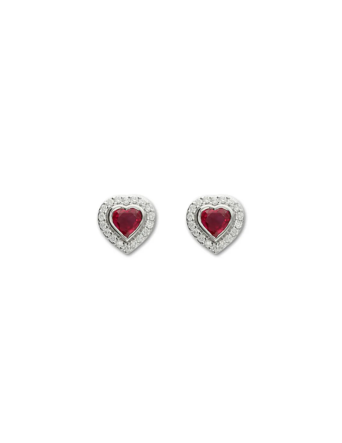 Pendientes de oro blanco 1ª Ley (750 mmas) con un rubí central talla corazón engastado en boquilla rodeado de diamantes talla brillante engastados en grano. Estos clásicos pendientes diseñados en forma de corazón son apropiados para la vida diaria o para cualquier evento. Cierre de palillo y presión.