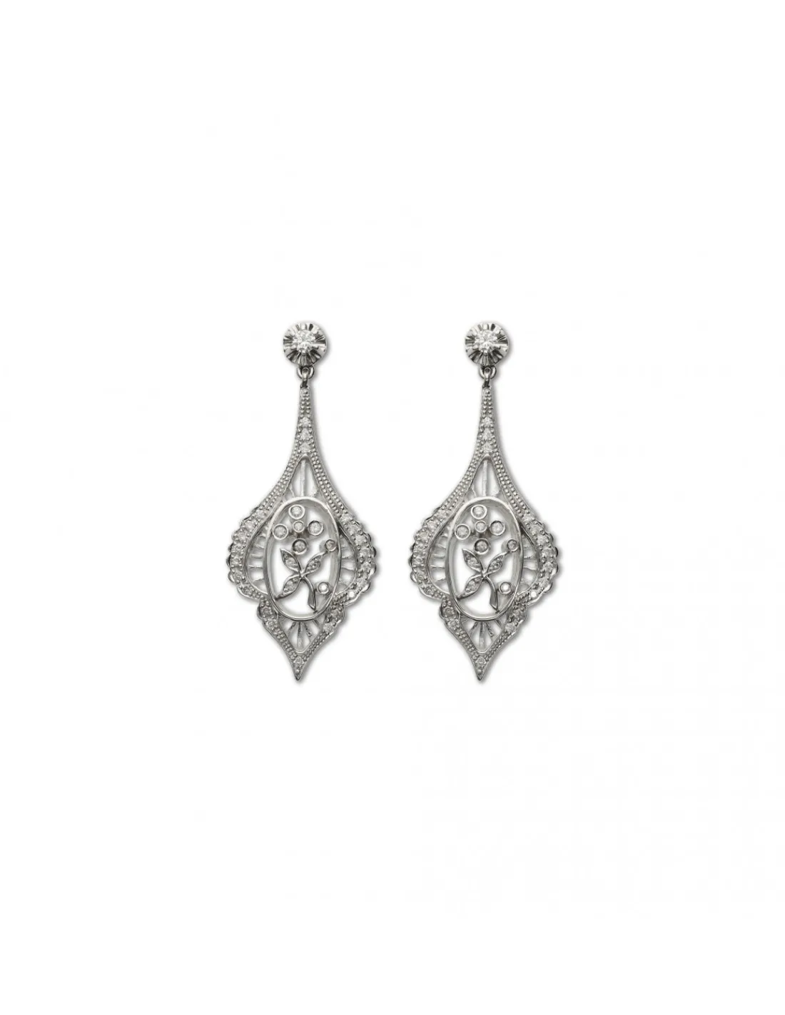 Pendientes de oro blanco 1ª Ley (750 mmas) estilo vintage con diamantes talla brillante. Largo aproximado 4,5 cm. Cierre de palillo y presión.