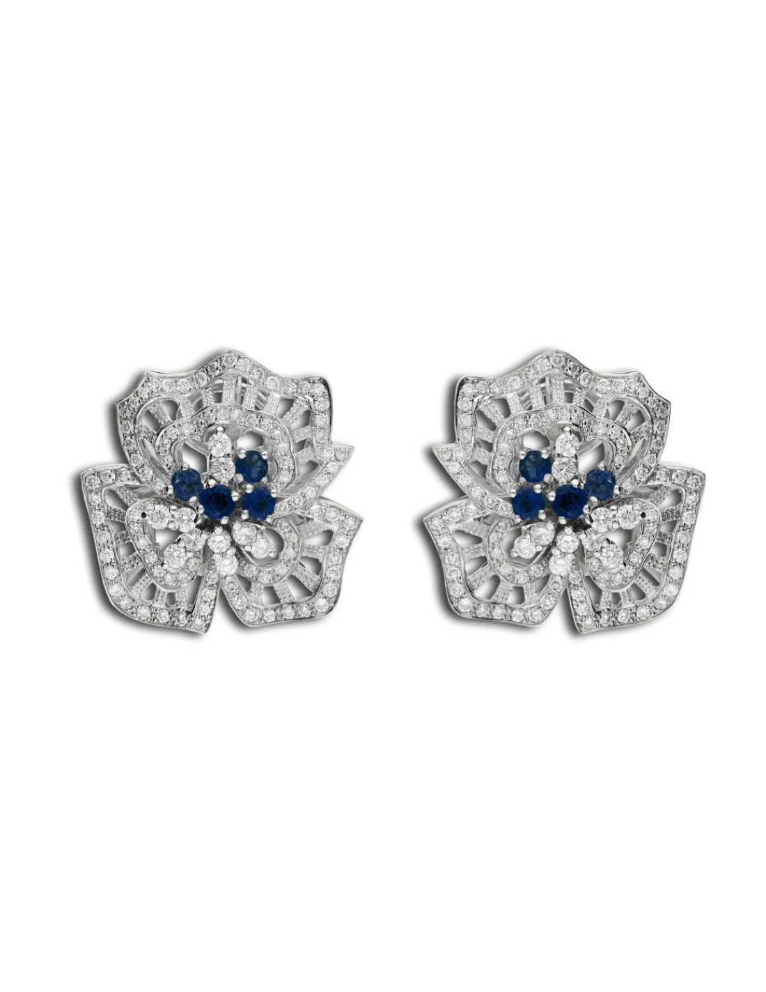 Pendientes de oro blanco 1ª Ley (750 mmas) estilo art deco con diseño de flor engastada con diamantes talla brillante y zafiros naturales. Una joya exclusiva para las mejores ocasiones.