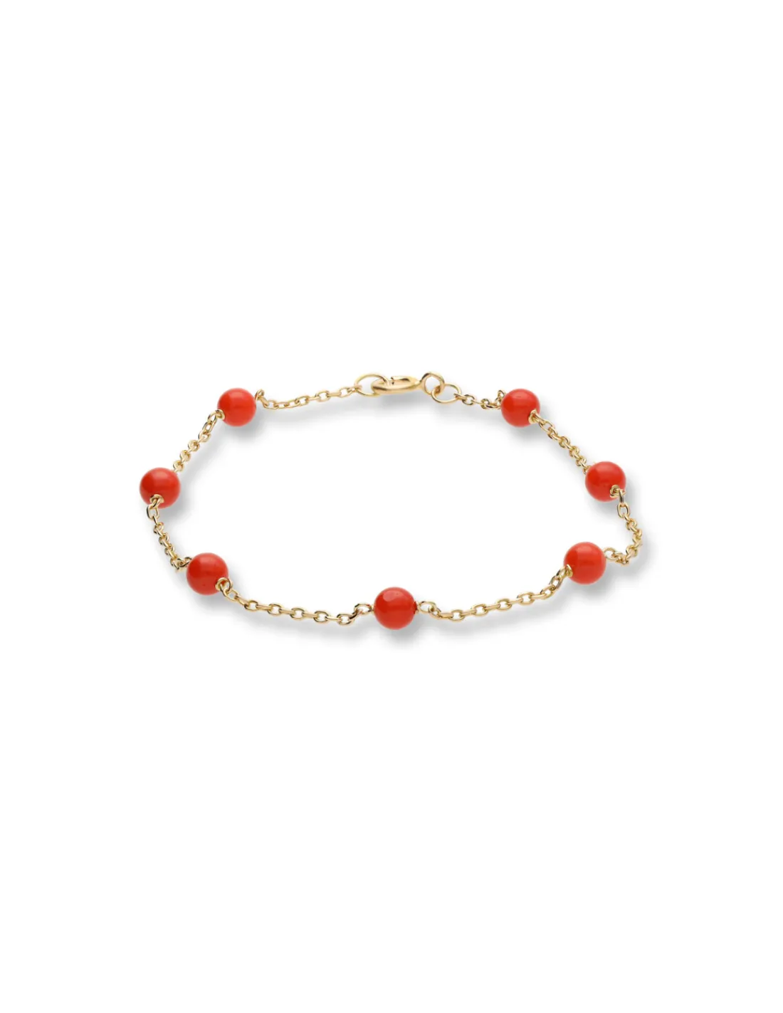 Pulsera de oro amarillo 1ª Ley (750 mmas) con bolas de coral. Una joya colorida que ofrece infinitas posibilidades de combinación.
