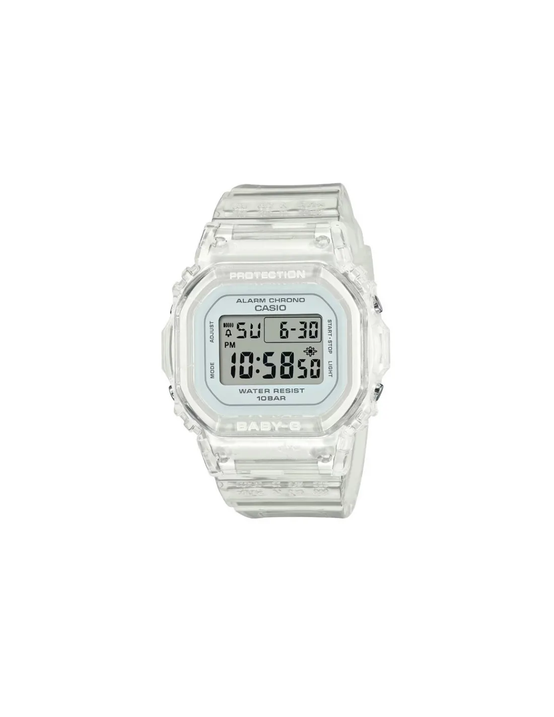 Reloj Casio Baby-G con caja de resina de 37,9 mm de diámetro, esfera digital, cristal mineral combinado con correa de resina. Resistente al agua hasta una presión de 10 bares. Duración aproximada de la batería: 2 años. Movimiento de cuarzo japonés.