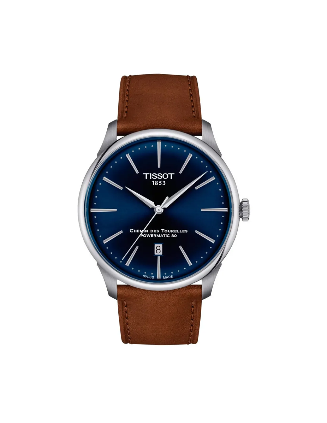 Reloj Tissot Chemin Des Tourelles Powermatic 80 para hombre con caja de acero de 42 mm de diámetro, esfera azul con efecto rayos de sol, índices y agujas plateados y correa de piel de vacuno marrón. Bajo la esfera se encuentra el Nivachron Powermatic 80, un movimiento mecánico automático de última generación con una reserva de marcha de 80 horas y antimagnetismo elevado. Un reloj para todos los tiempos.