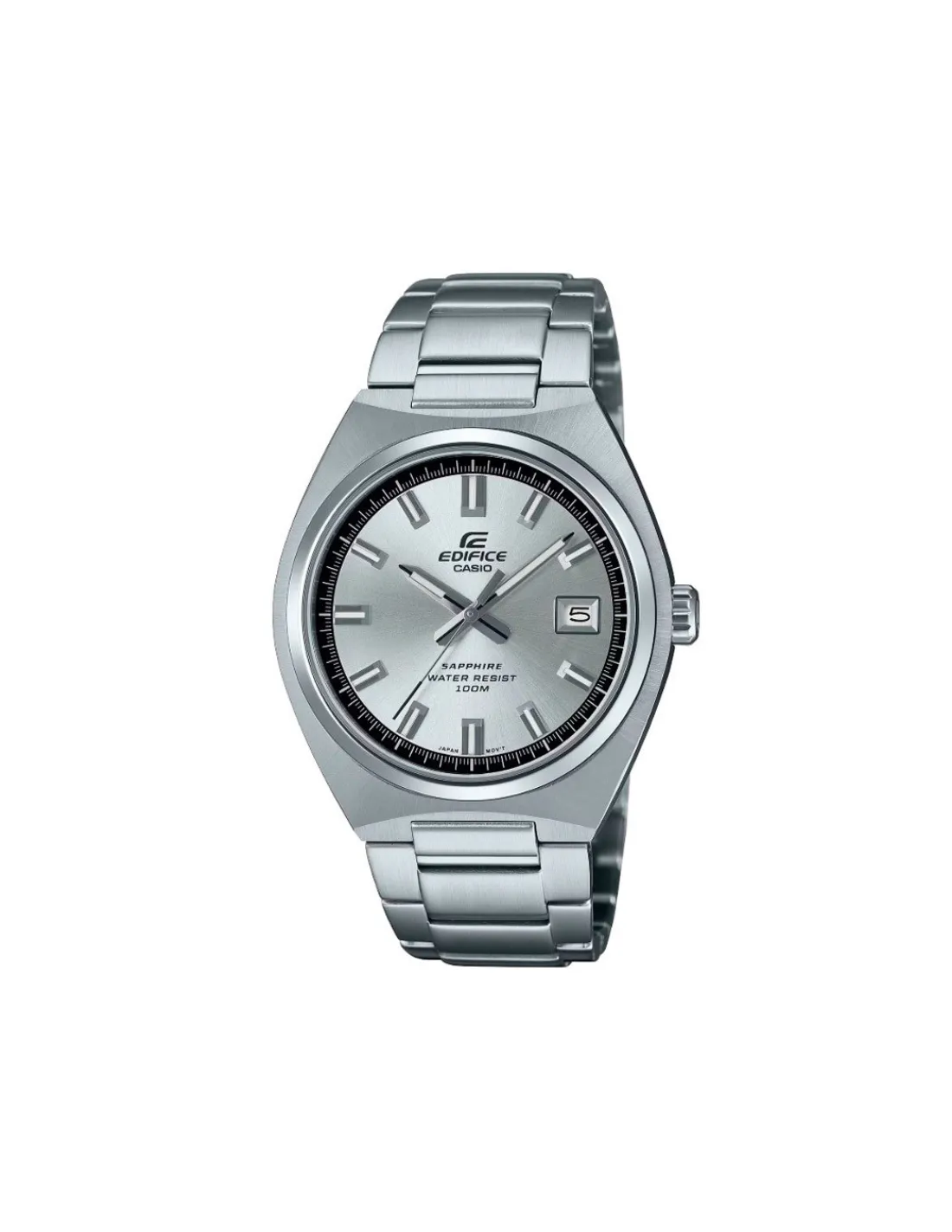 Reloj Casio Edifice con caja de acero inoxidable de 38,5 mm de diámetro, esfera plata y cristal de zafiro combinado con brazalete de acero. Duración aproximada de la batería: 3 años en SR920SW. Movimiento de cuarzo japonés.
