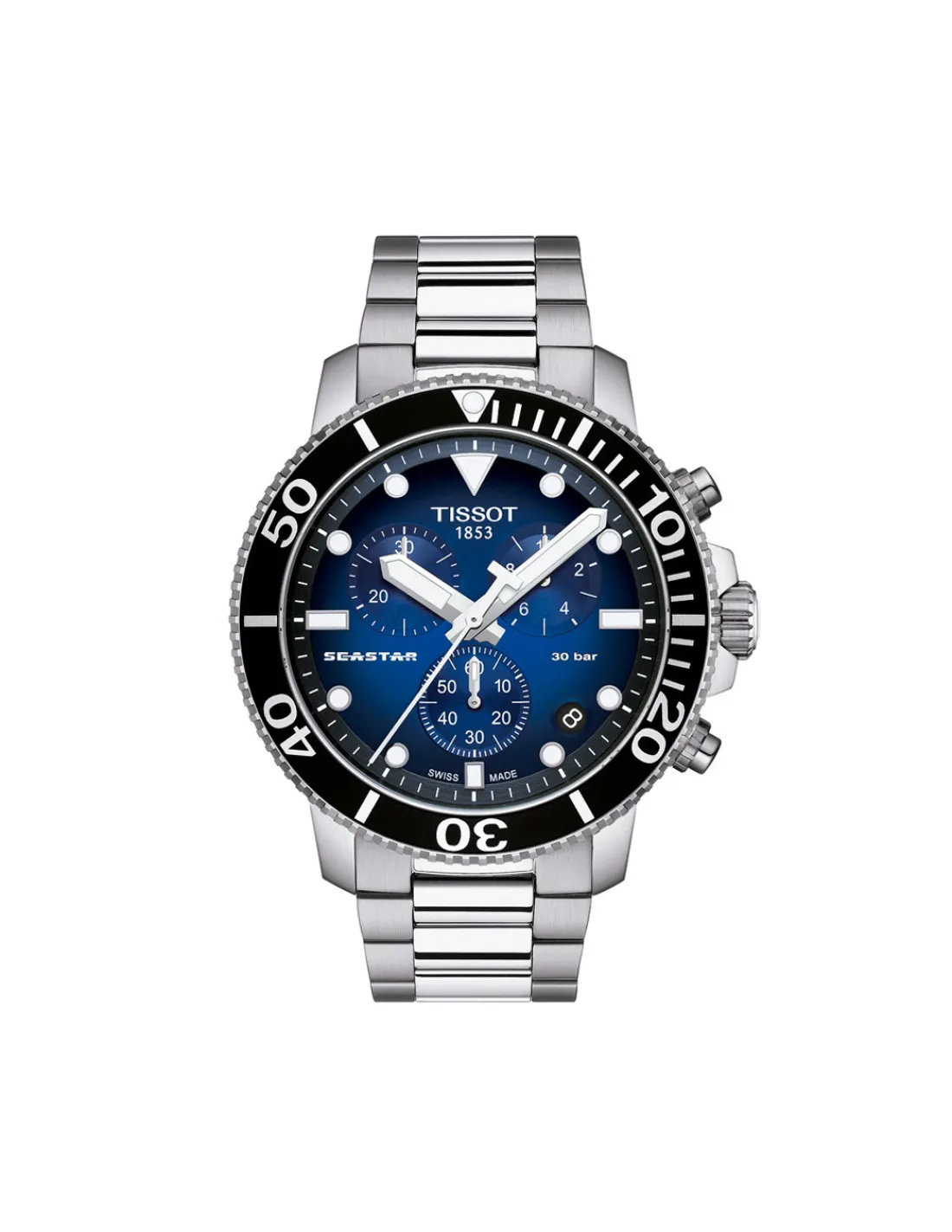 Reloj Tissot Seastar 1000 Chronograph T120.417.11.041.01 para hombre con caja de acero, esfera azul con bisel negro que combina con elementos blancos y brazalete de acero. Movimiento de cuarzo Swiss Made.
