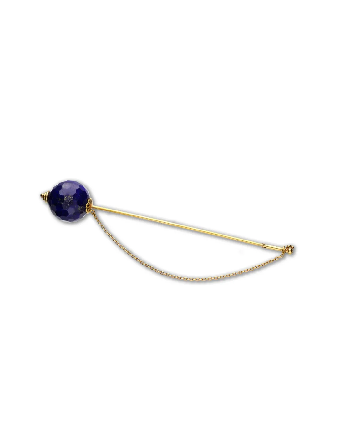 Alfiler de oro amarillo 1ª Ley (750 mmas) y lapislazuli redondo talla briolette con cierre de seguridad de cadena y tapón. Una joya para mujeres que se sientan atraidas por joyas originales.