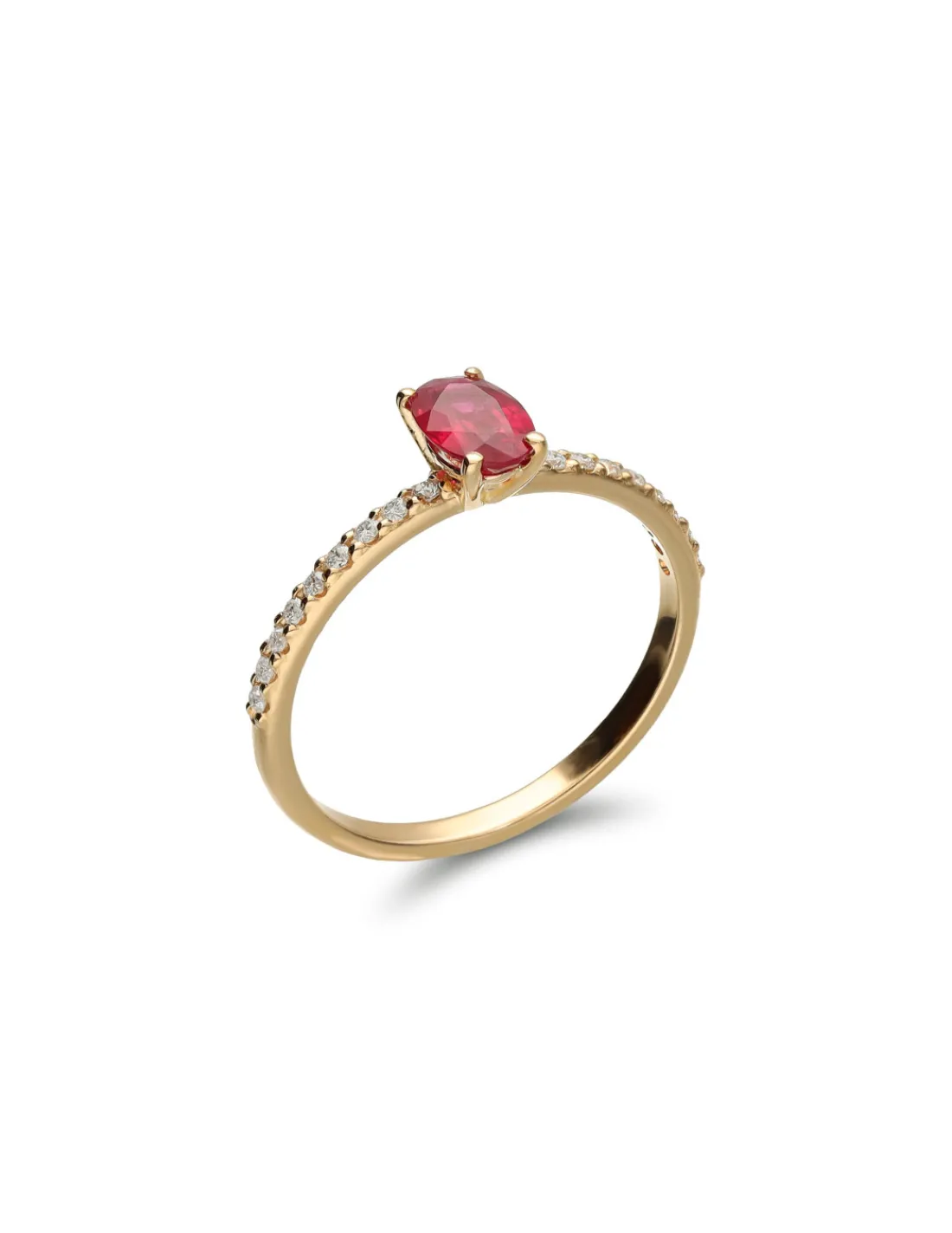 Anillo de oro amarillo 1ª Ley (750 mmas) con un rubí natural talla oval en el centro y diamantes en los laterales del aro. Una joya llamativa que aporta claridad y destaca por su radiante piedra roja.