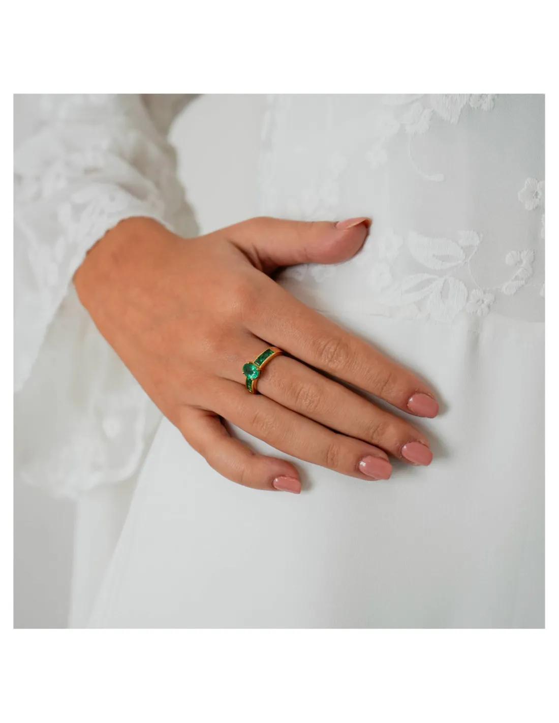 Anillo de oro amarillo 1ª Ley (750 mmas) con esmeralda oval en el centro combinada con esmeraldas talla carré en el aro.