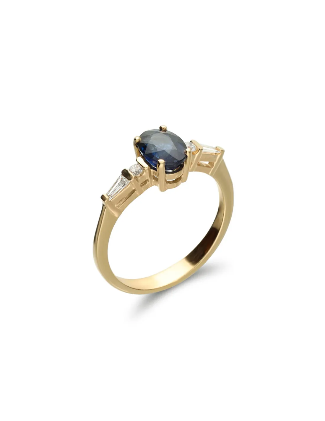 Anillo de oro amarillo 1ª Ley (750 mmas) con zafiro talla oval en el centro acompañado de diamantes talla brillante y talla taipe. Un original anillo con relucientes diamantes ideal para día como para noche.