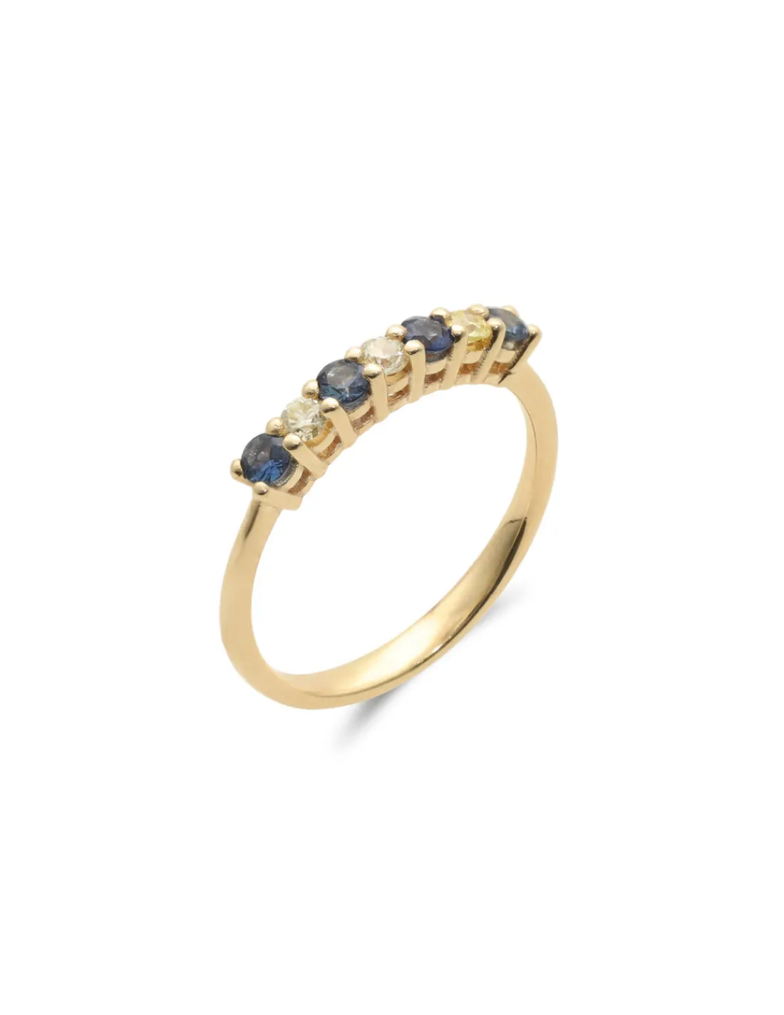Anillo de oro amarillo 9 kt (375 mmas) con zafiros redondos y diamantes talla brillante.