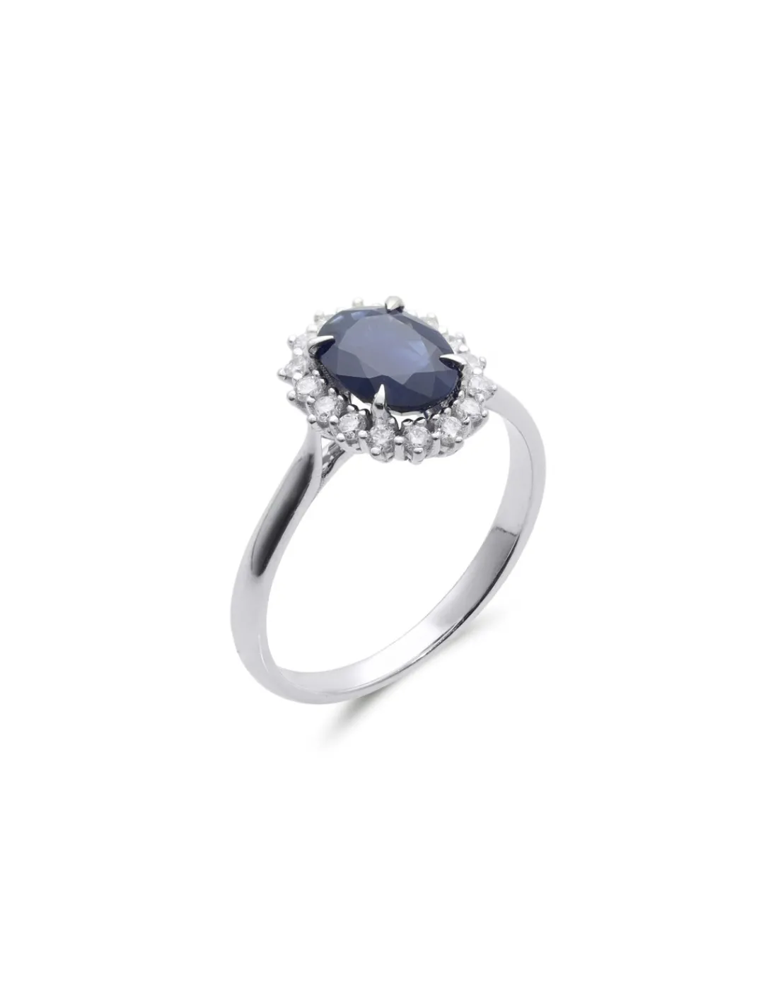 Anillo de oro blanco 1ª Ley (750 mmas) con un zafiro talla oval natural como protagonista en el centro rodeado de una orla de diamantes talla brillante. Talla 12.