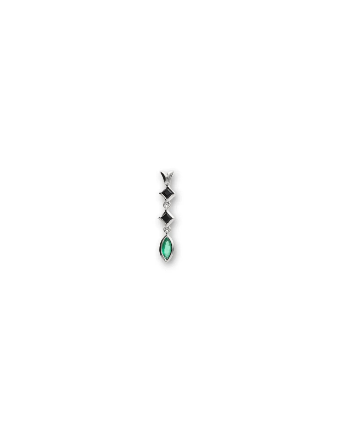 Colgante de oro blanco 1ª Ley (750 mmas) con esmeralda talla marquise acompañada de ónix cuadrado. Tamaño aproximado incluyendo reasa 2,1 cm.