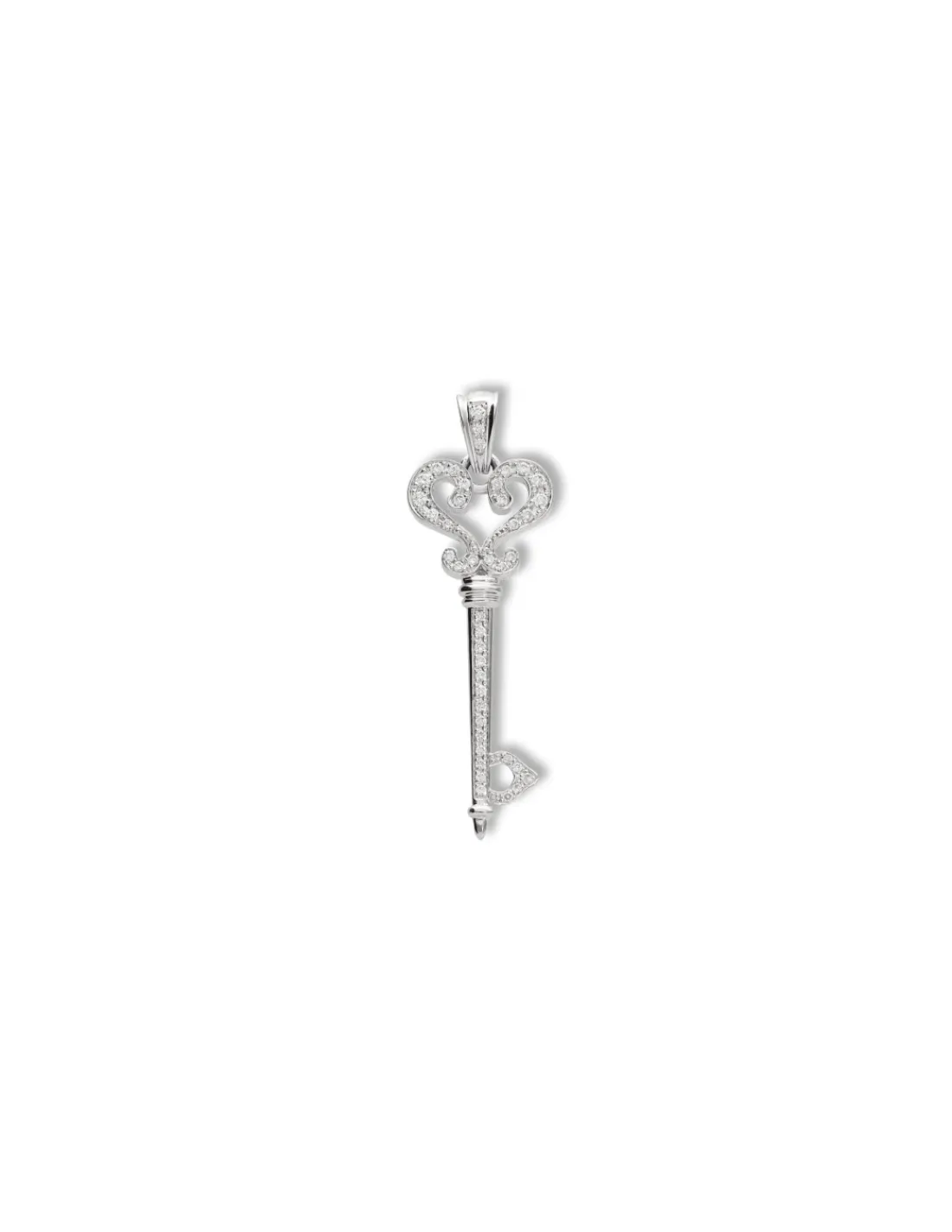 Colgante de oro blanco 1ª Ley (750 mmas) con forma de llave y diamantes talla brillante engastados en grano.