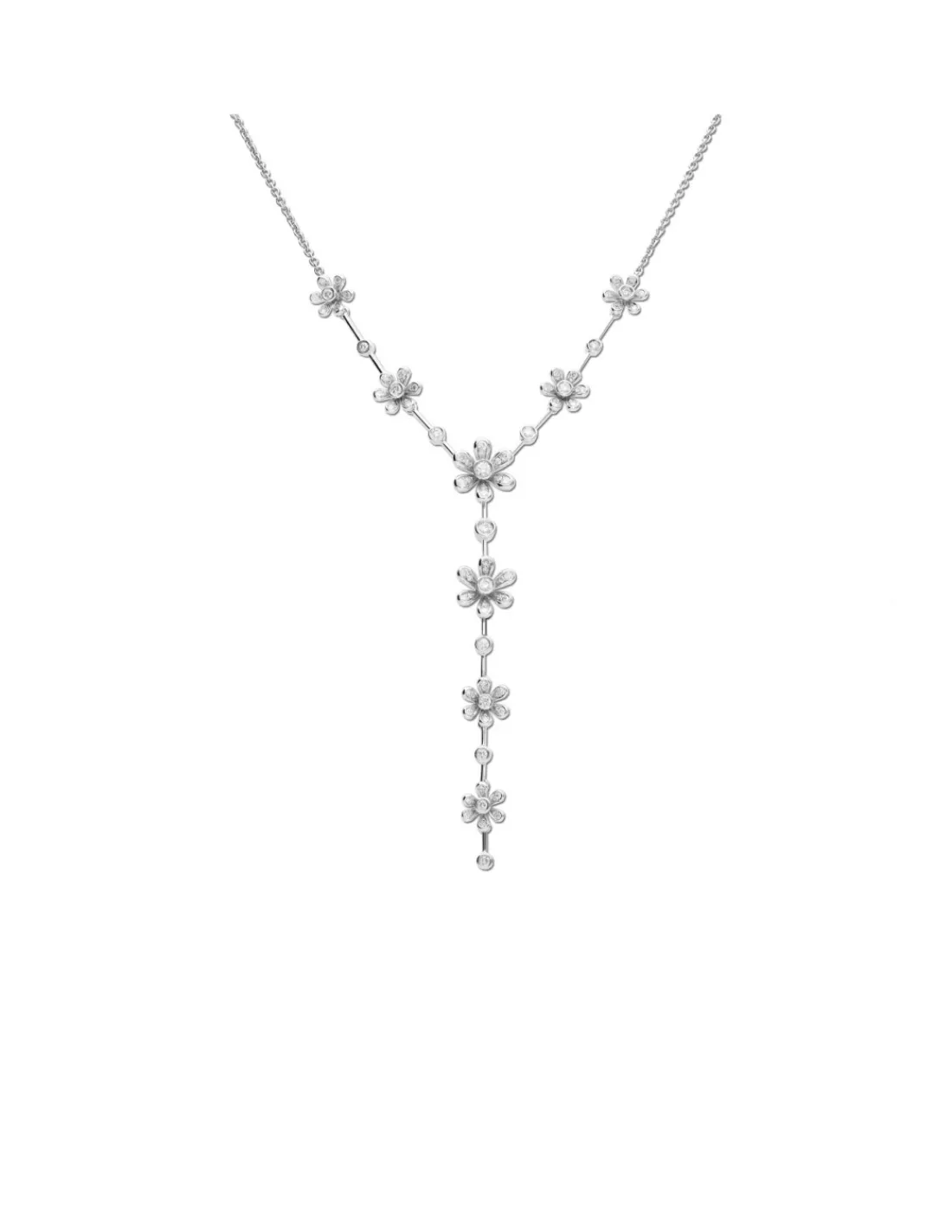 Collar de oro blanco 1ª Ley (750 mmas) diseñado con margaritas y diamantes engastados.