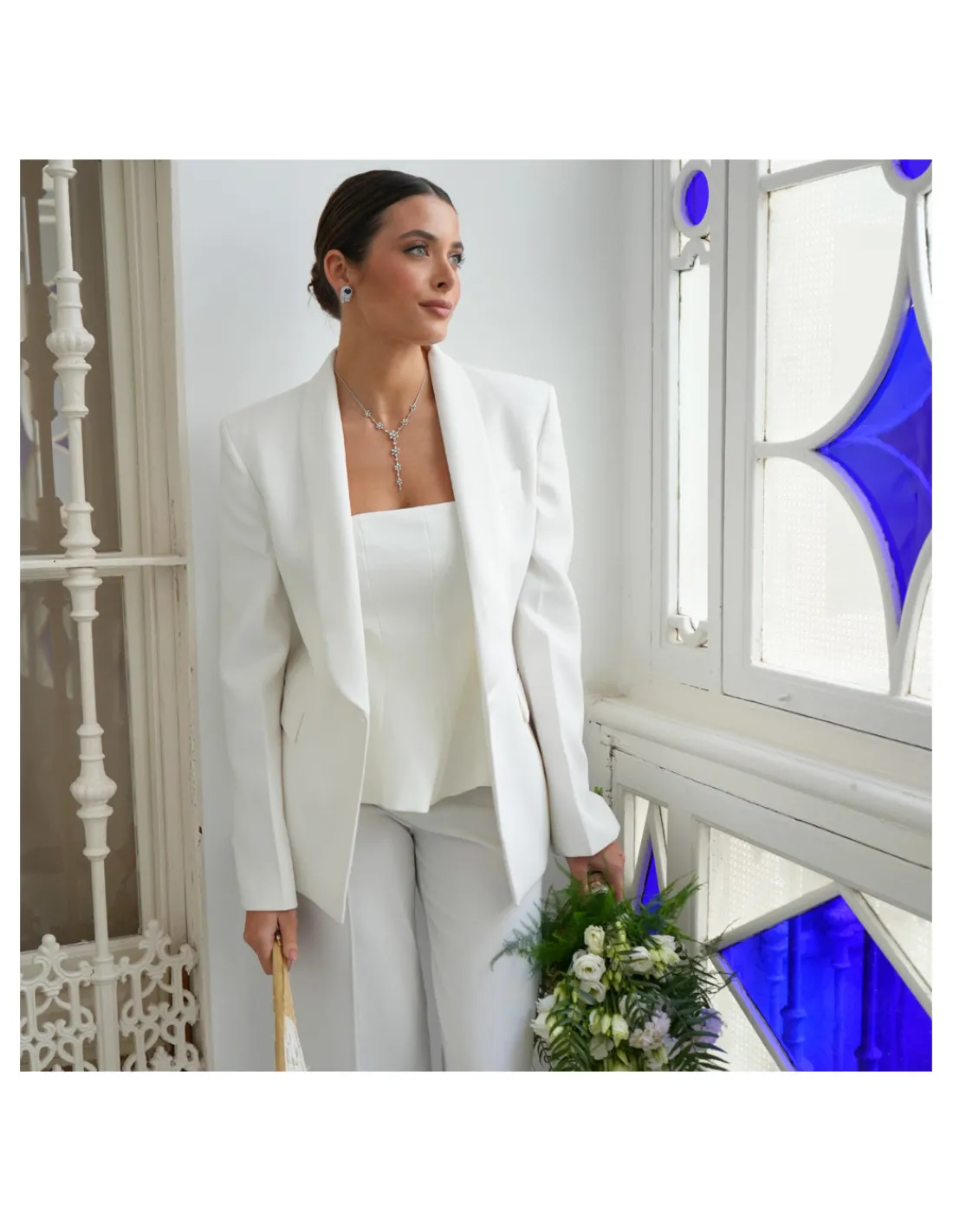 Gargantilla de oro blanco 1ª Ley (750 mmas) con diseño floral y diamantes talla brillante. Cierre de cadena. Longitud cadena 40 cm. Largo colgante 7,5 cm.