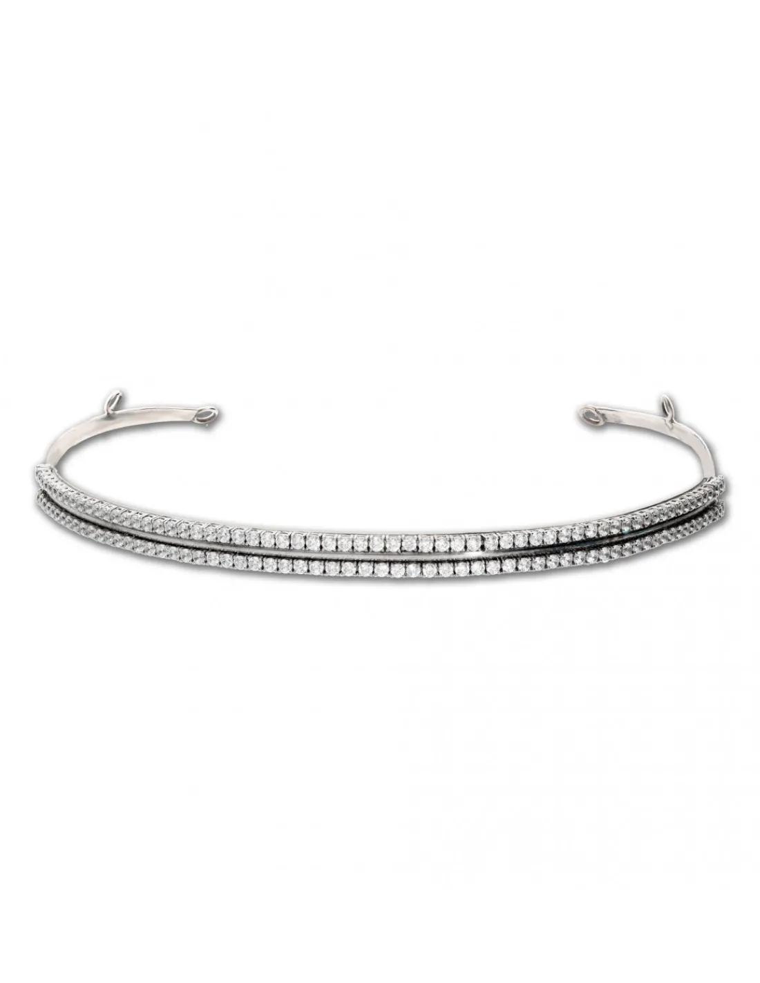 Diadema de plata 1ª Ley (925 mmas) con dos líneas de circonitas talla brillante al estilo riviere doble. El complemento ideal para novias que buscan una joya artesanal que pase de generación en generación.