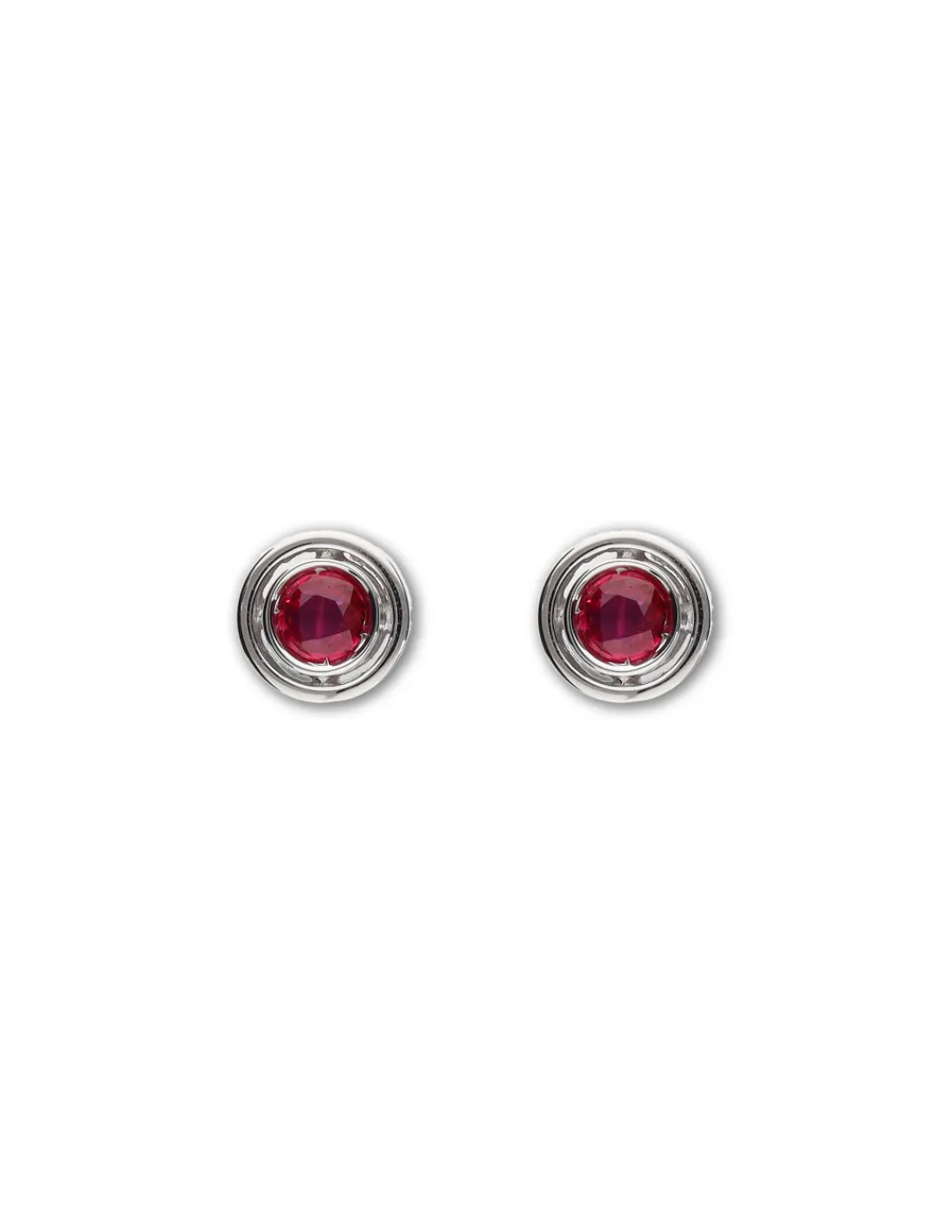 Pendientes dormilonas de oro blanco 1ª Ley (750 mmas) con rubí redondo en el centro. Una joya para llevar en tu día a día con un look más informal o para noches especiales. Cierre de palillo y presión. Diámetro 7,50 mm.
