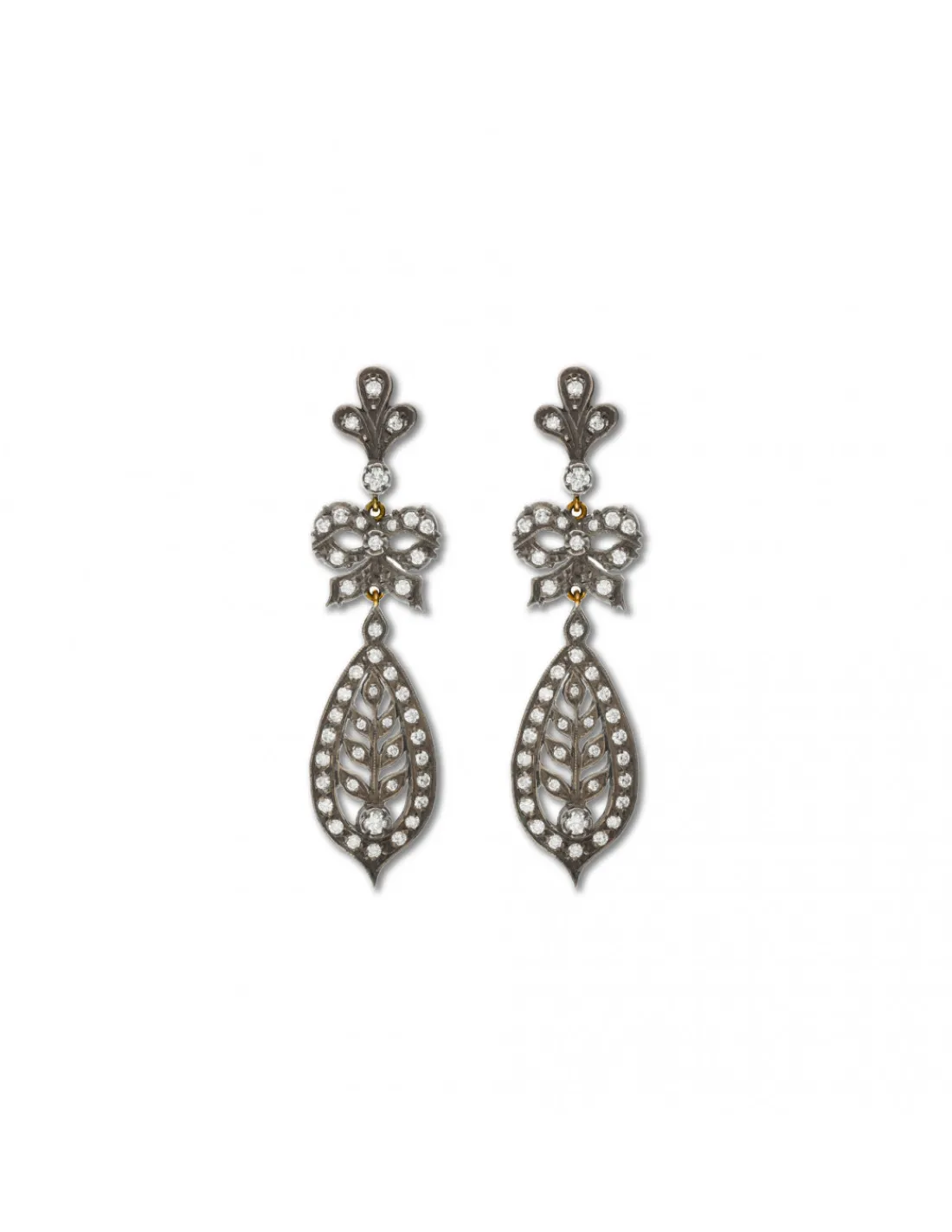 Pendientes de oro amarillo 1ª Ley (750 mmas) y plata 1 Ley (925 mmas) con estilo vintage y fabricados artesanalmente como se hacían antiguamente con base de oro y lámina de plata donde van engastados los diamantes. Un diseño largo con lazada central e ideal tanto para novia como madrina o invitada. Largo aproximado 6,5 cm. Cierre de ballestilla.