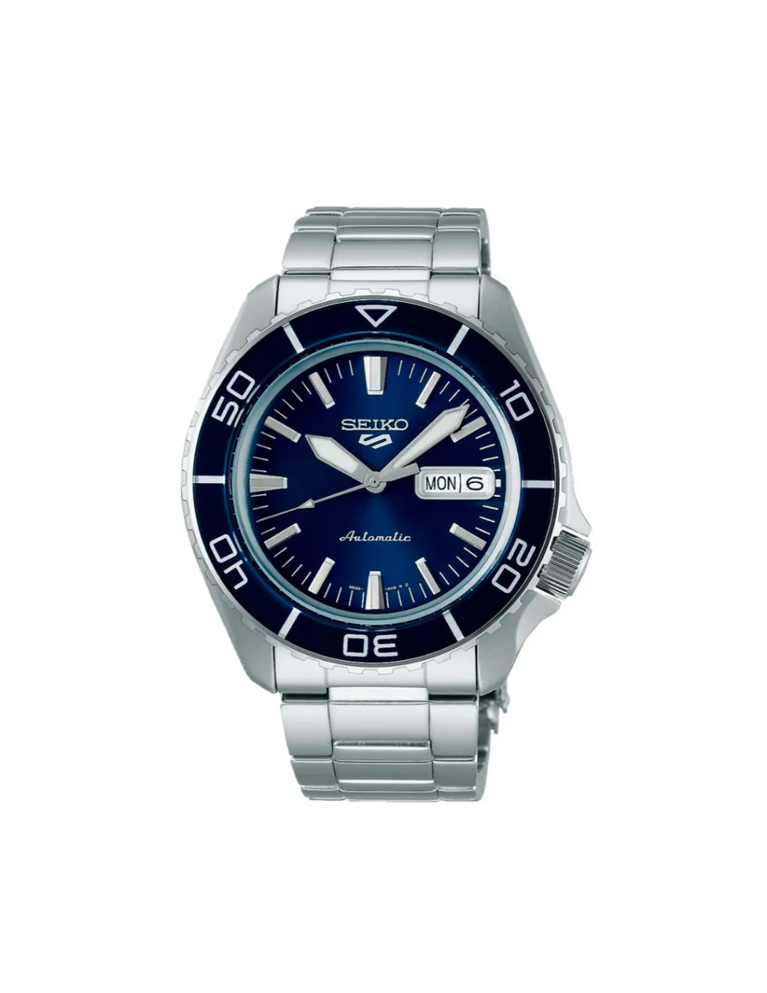 Reloj Seiko 5 Sports SKX series SRPK97K1 para hombre con caja de acero inoxidable, esfera azul y brazalete. Movimiento automático con capacidad de carga manual.