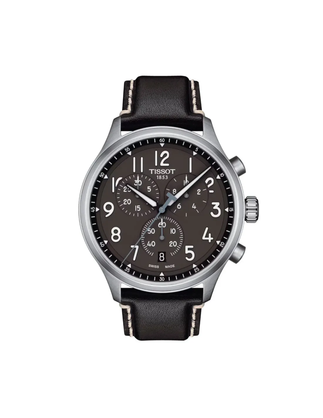 Reloj Tissot Chrono XL para hombre con caja de acero de 45 mm de diámetro, esfera negra con números árabes superluminova y correa de piel de vacuno negra con relieve y pespuntes blancos. Un reloj para aquellos que buscan un cronógrafo deportivo y elegante, con tecnología suiza y movimiento de cuarzo Swiss Made.
