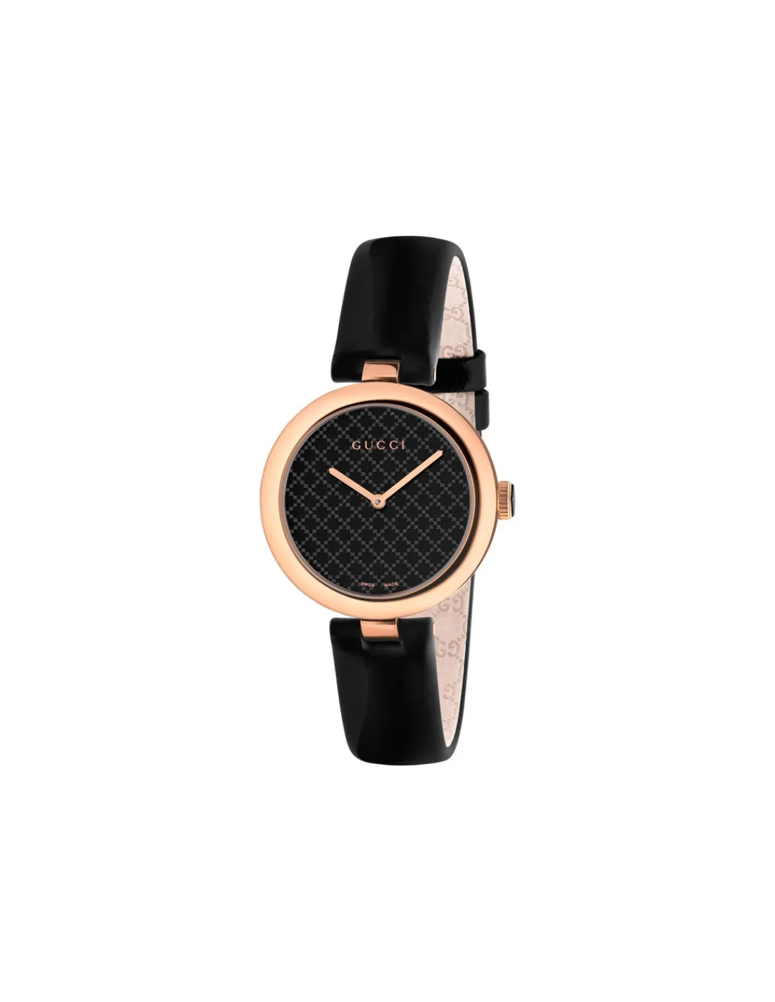 Reloj Gucci Diamantissima YA141401 para mujer con esfera negra con motivo diamante grabado y caja en acero y oro rosado acompañado de correa de piel negra. Movimiento de cuarzo Swiss Made.