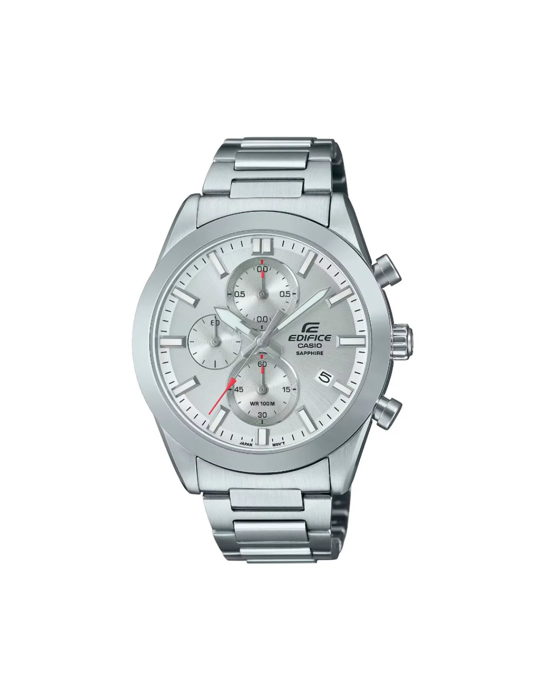 Reloj Casio Edifice para hombre con caja de acero inoxidable de 41 mm de diámetro, esfera plata y cristal de zafiro con revestimiento antirreflejos combinado con brazalete de acero. Cronómetro de 1/10 segundos. Movimiento de cuarzo japonés.