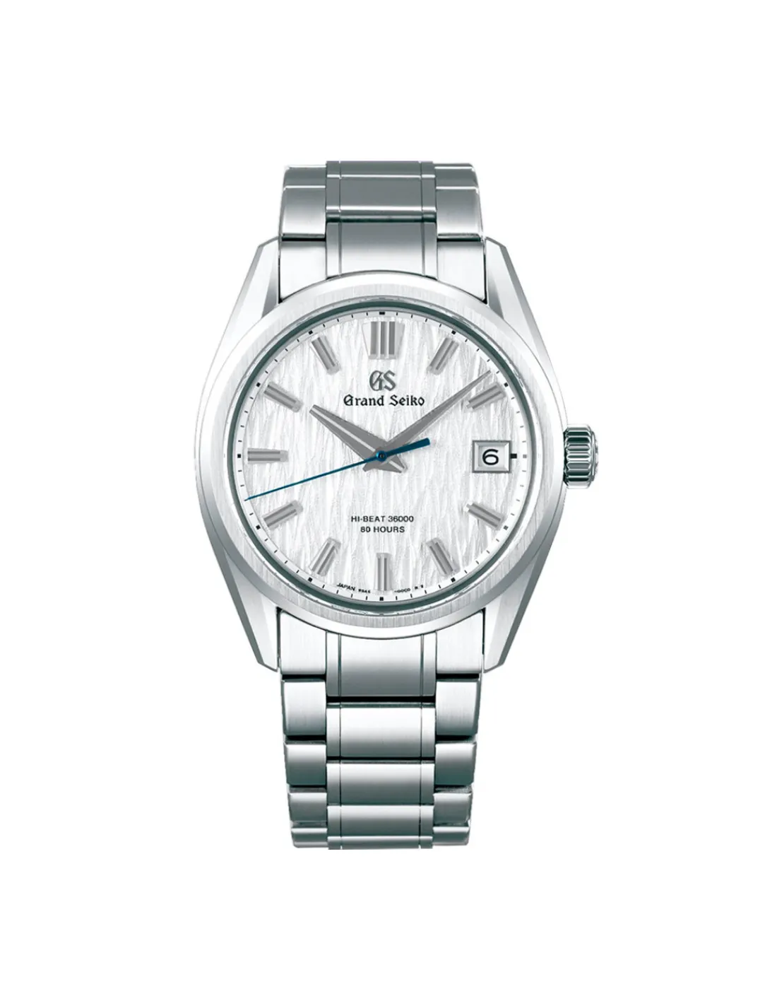 Reloj Grand Seiko Heritage Serie 9 con caja de acero de 40 mm, esfera blanca/plata inspirada en los bosques de abedules blancos con agujas e índices acanalados, aguja del segundero en color azul y cristal de zafiro con revestimiento antirreflectante en la superficie interna combinado con brazalete. Posee un movimiento mecánico calibre 9SA5, que le otorga una reserva de marcha de 80 horas gracias a su mayor eficiencia energética. Este calibre incorpora tres desarrollos significativos que establecen un nuevo estándar en relojería de alta frecuencia, el escape Dual Impulse completamente nuevo, el volante de espiral libre y el tren de engranajes horizontal.