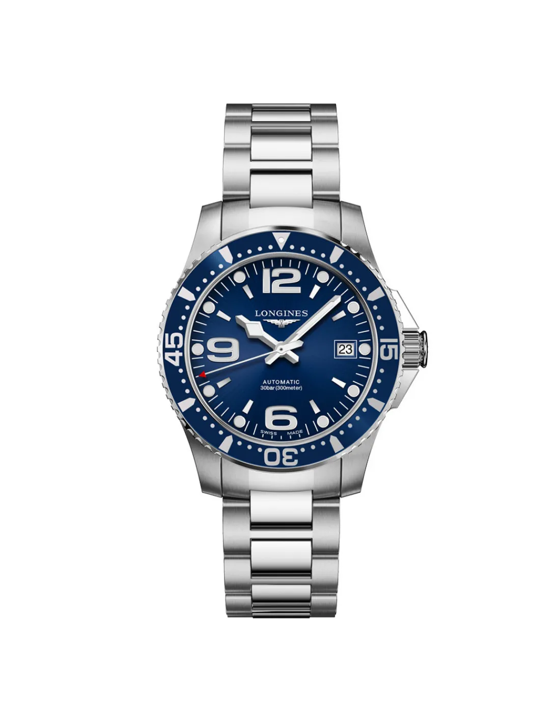 Reloj Longines Hydroconquest unisex con caja de acero de 39 mm, esfera azul efecto rayos de sol, bisel azul y brazalete de acero. Movimiento automático Swiss Made. Una pieza emblemática de la marca Suiza.