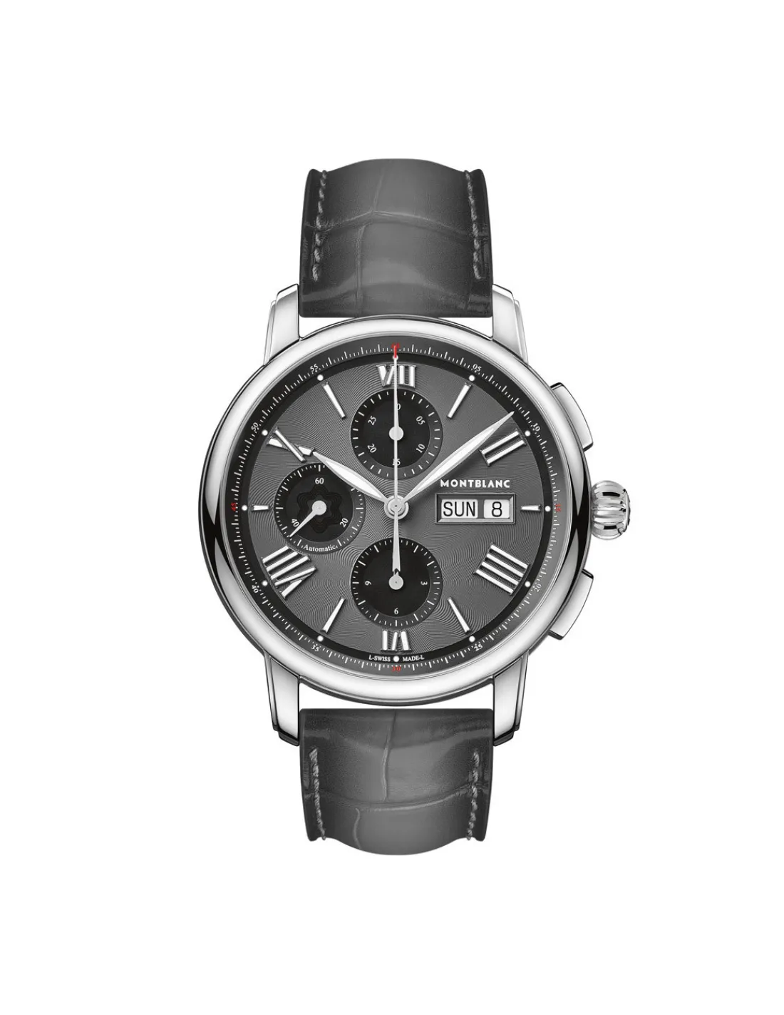 Reloj Montblanc Star Legacy Cronograph para hombre con caja de acero de 43 mm, esfera gilloché color gris con números romanos y correa de piel de cocodrilo gris. Inspirado en los relojes de bolsillo que fabricaba Minerva a finales del siglo XIX. Un reloj elegante de líneas actuales. Movimiento cronógrafo automático Swiss Made.