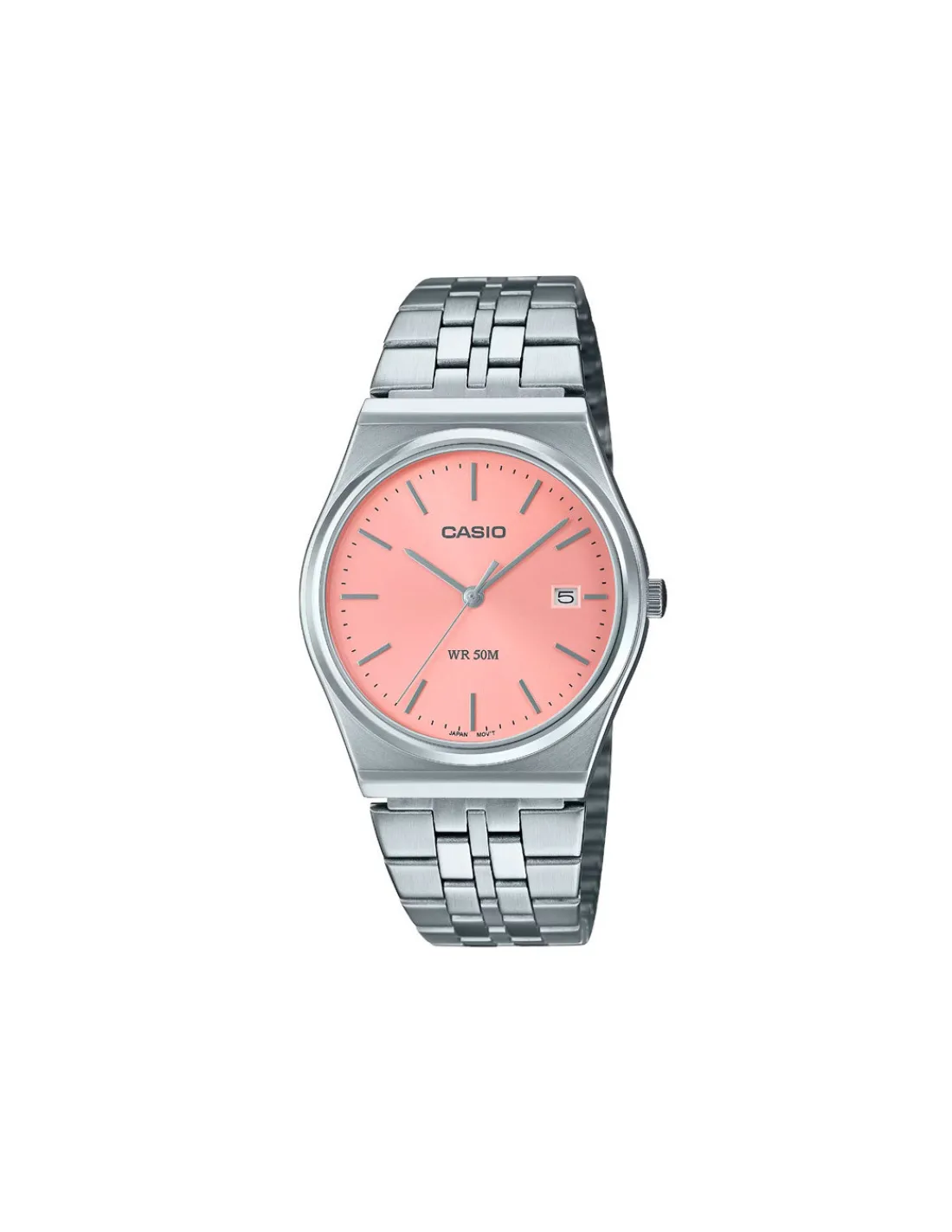 Reloj Casio Timeless para mujer con caja de acero inoxidable de 35 mm de diámetro, esfera analógica color rosa, cristal mineral y brazalete de acero. Movimiento de cuarzo japonés. Sumergible 50 metros.